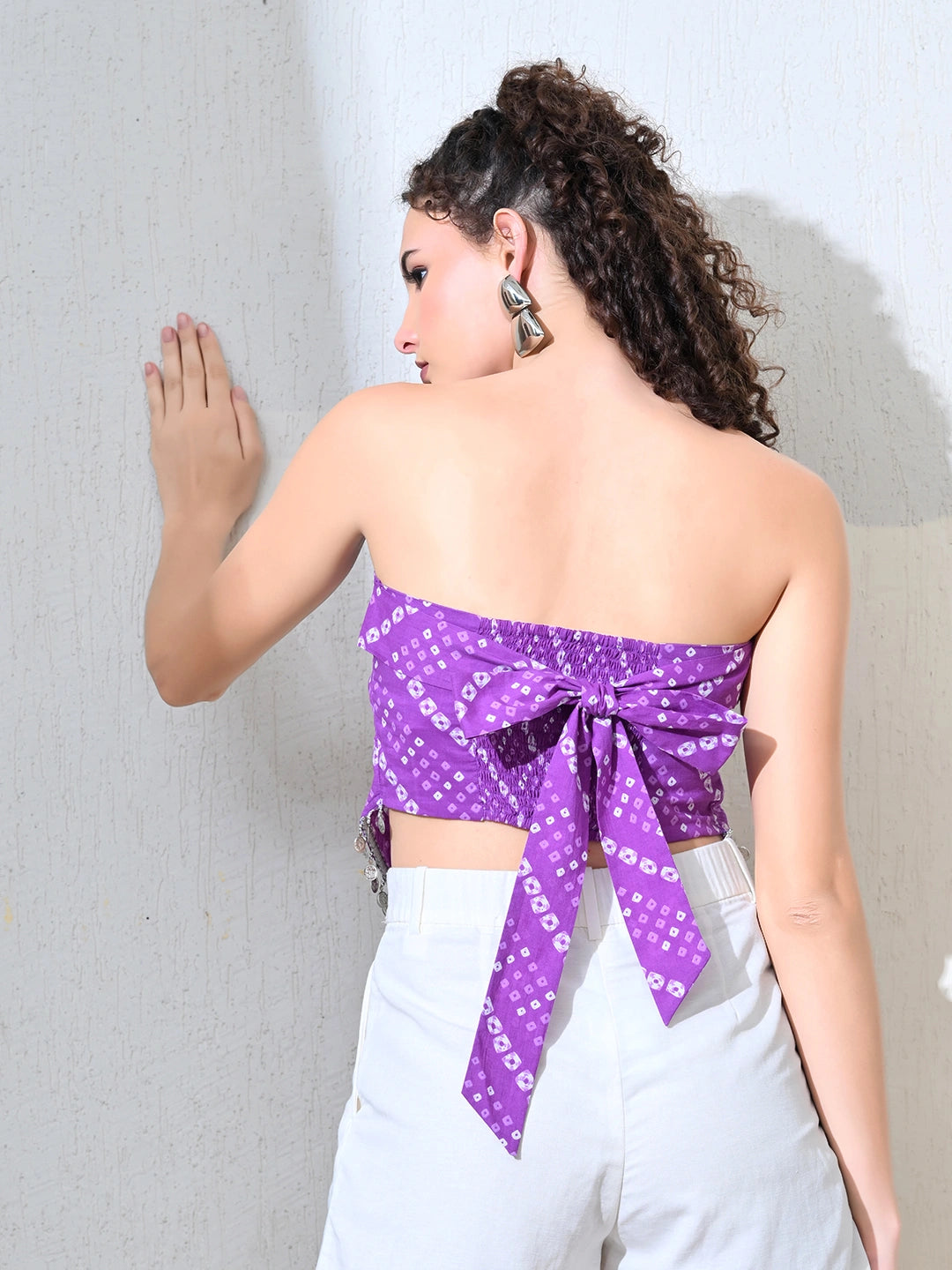 A vibrant purple bandhani crop top crafted in soft, breathable fabric, showcasing traditional tie-dye patterns. The handkerchief hem is highlighted with shimmering coin detailing that adds playful movement. Designed with a smocked back for ease and comfort, and finished with adjustable tie-up straps for a custom fit, this top blends bohemian charm with festive flair.