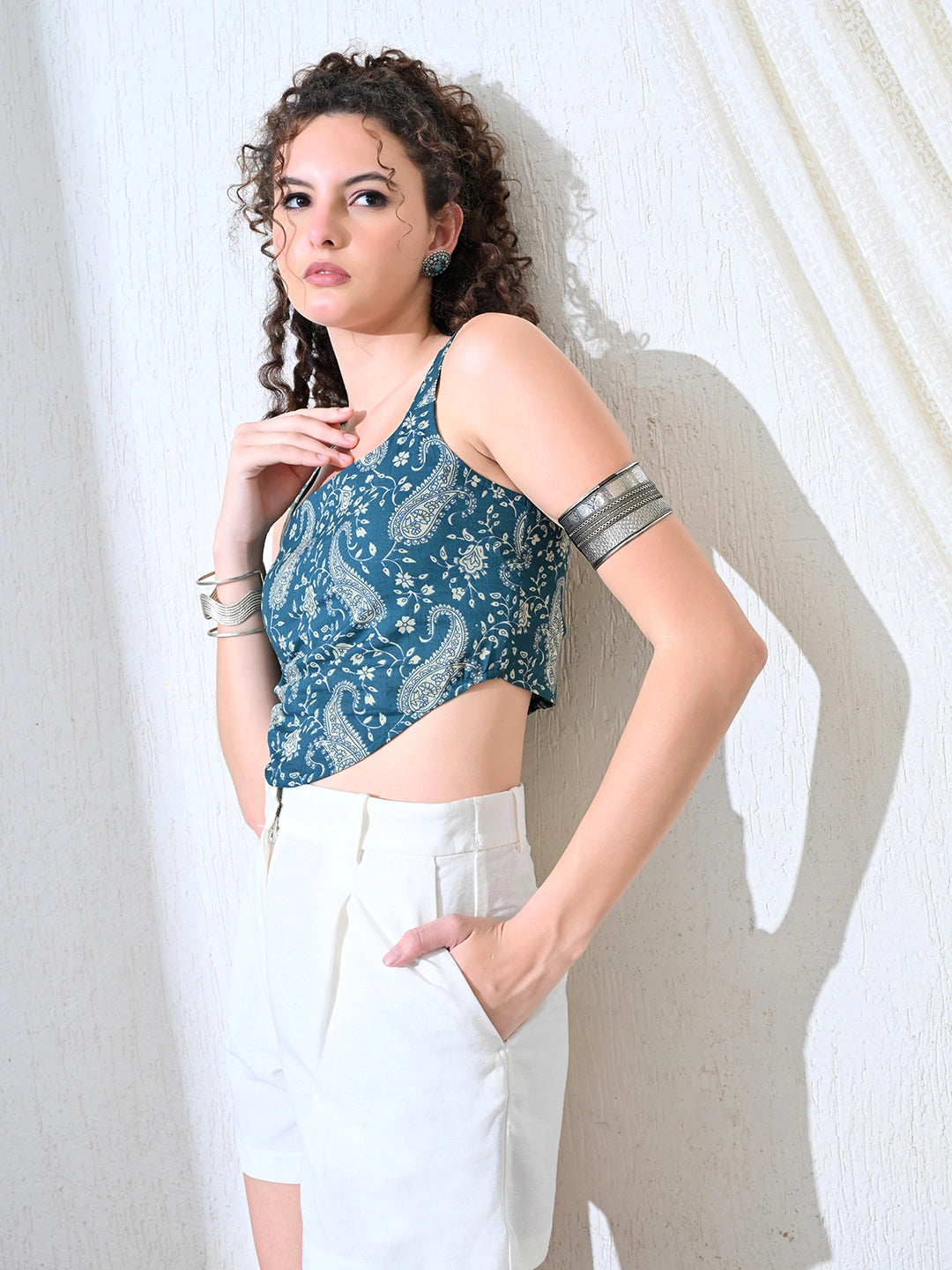 Infuse your wardrobe with festive boho charm in this paisley printed corset top, crafted from 100% cotton for all-day comfort. Featuring a structured bodice and a flattering silhouette, the top is designed with an elasticated back for ease and flexibility. The vibrant paisley print adds a playful touch, making it the perfect statement piece for celebrations, getaways, or sunlit days out.
