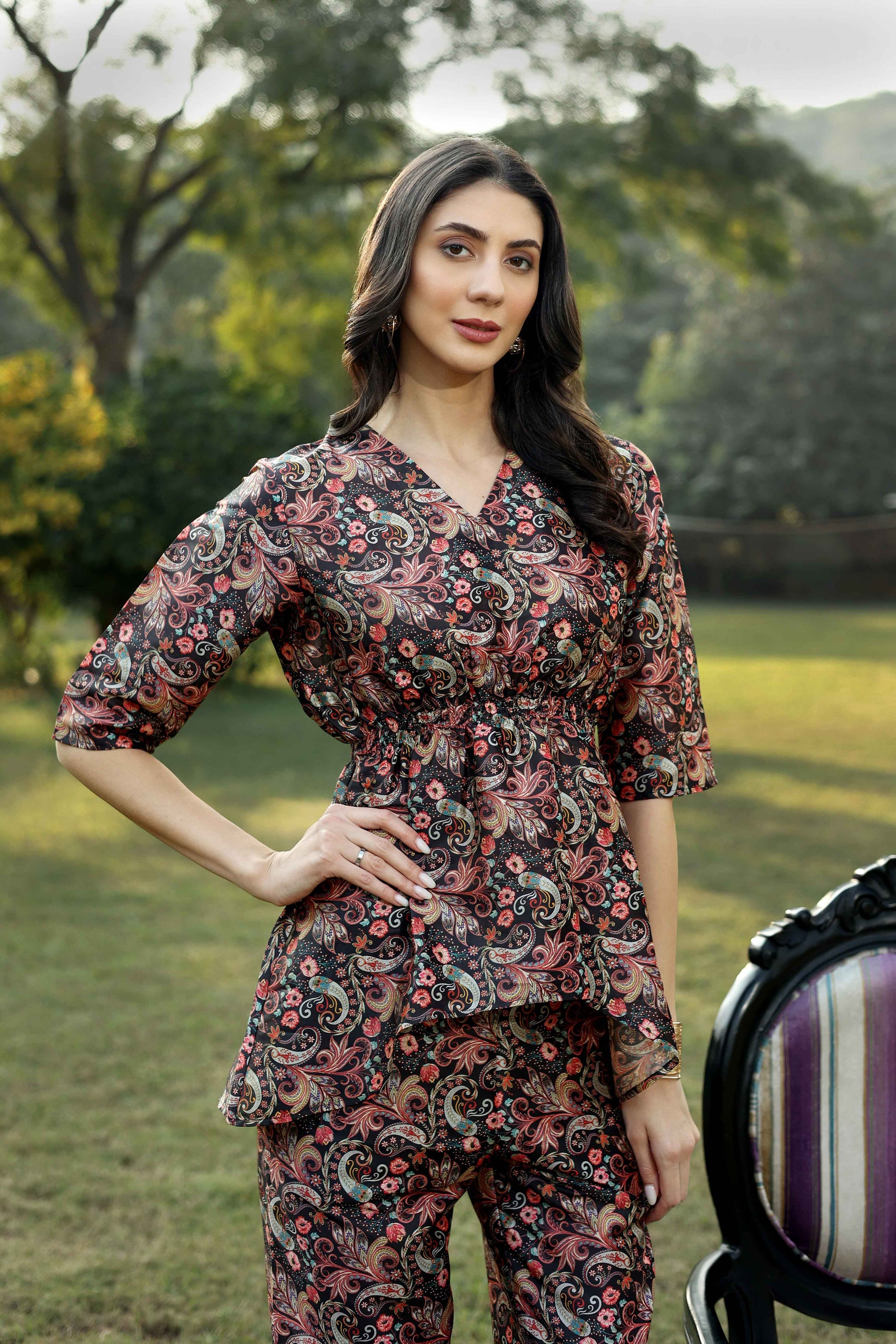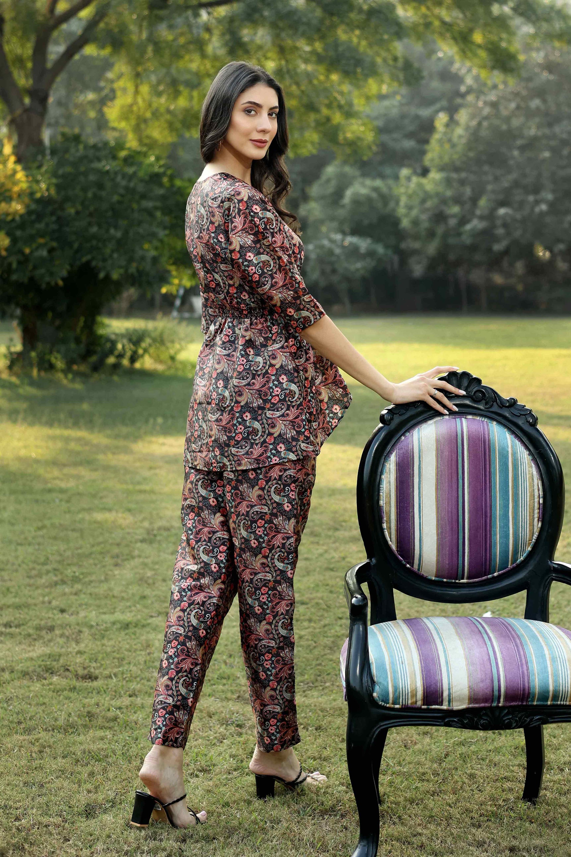 The ankle-length trousers perfectly complement the top, creating a seamless and polished look. Crafted from a rich, intricately printed fabric adorned with paisley and floral motifs in earthy tones, this ensemble is a timeless blend of tradition and contemporary charm.