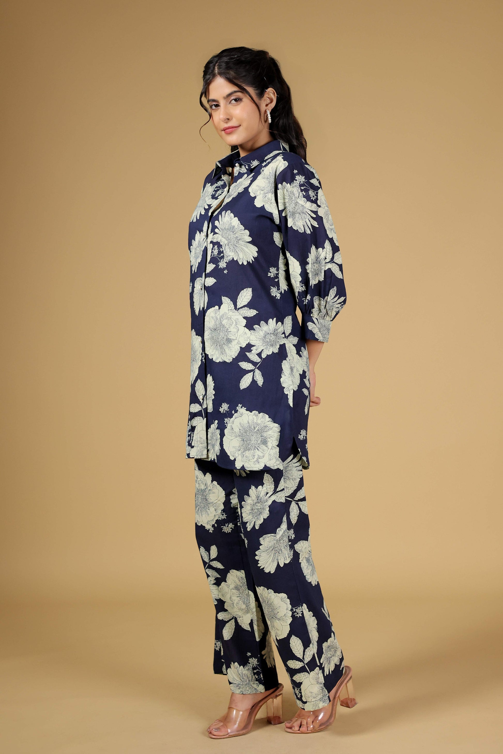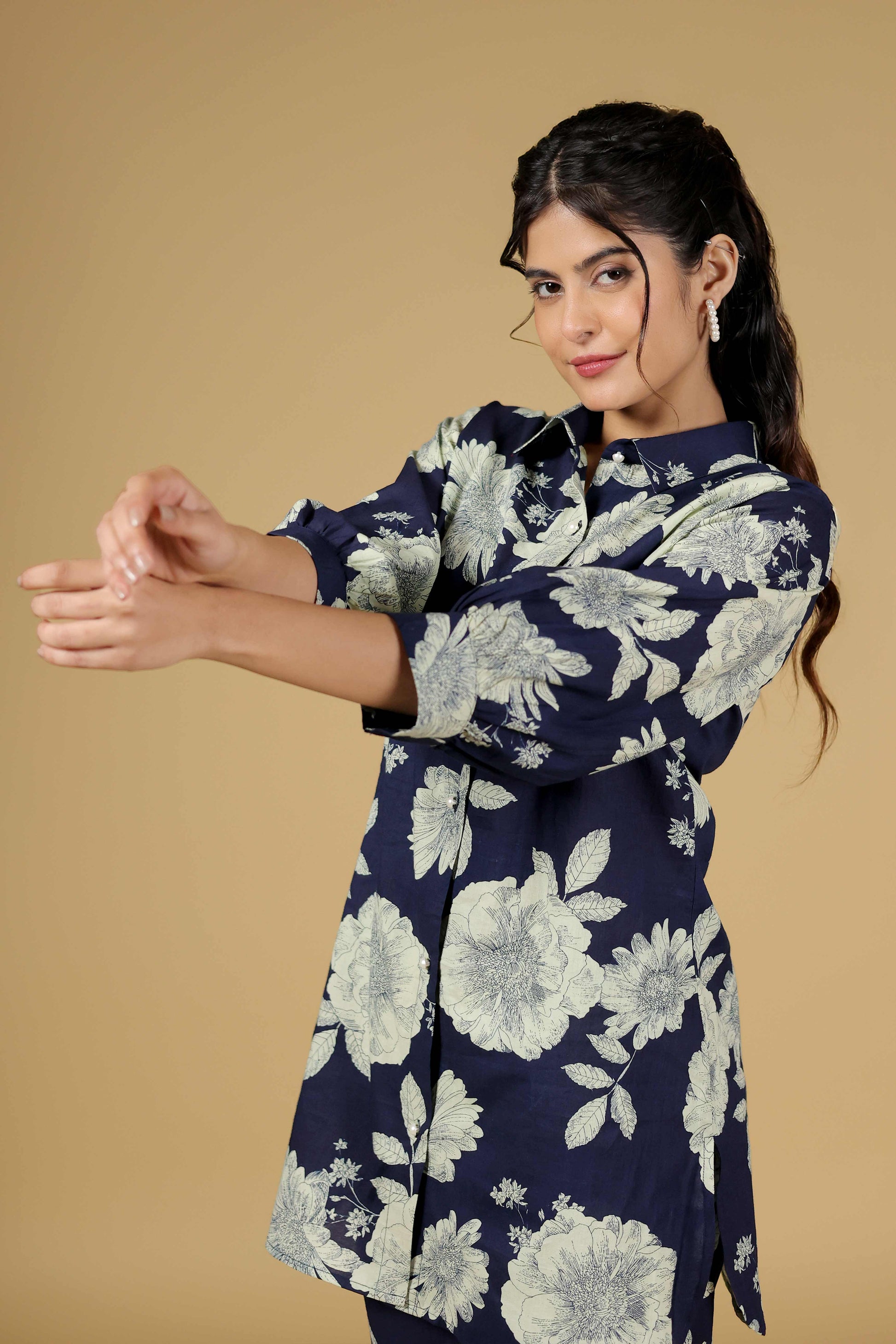 Made from 100% soft cotton, this stylish blue printed outfit is perfect for both comfort and elegance. The button-down tunic features a standard collar and an apple hemline, adding a flattering shape.