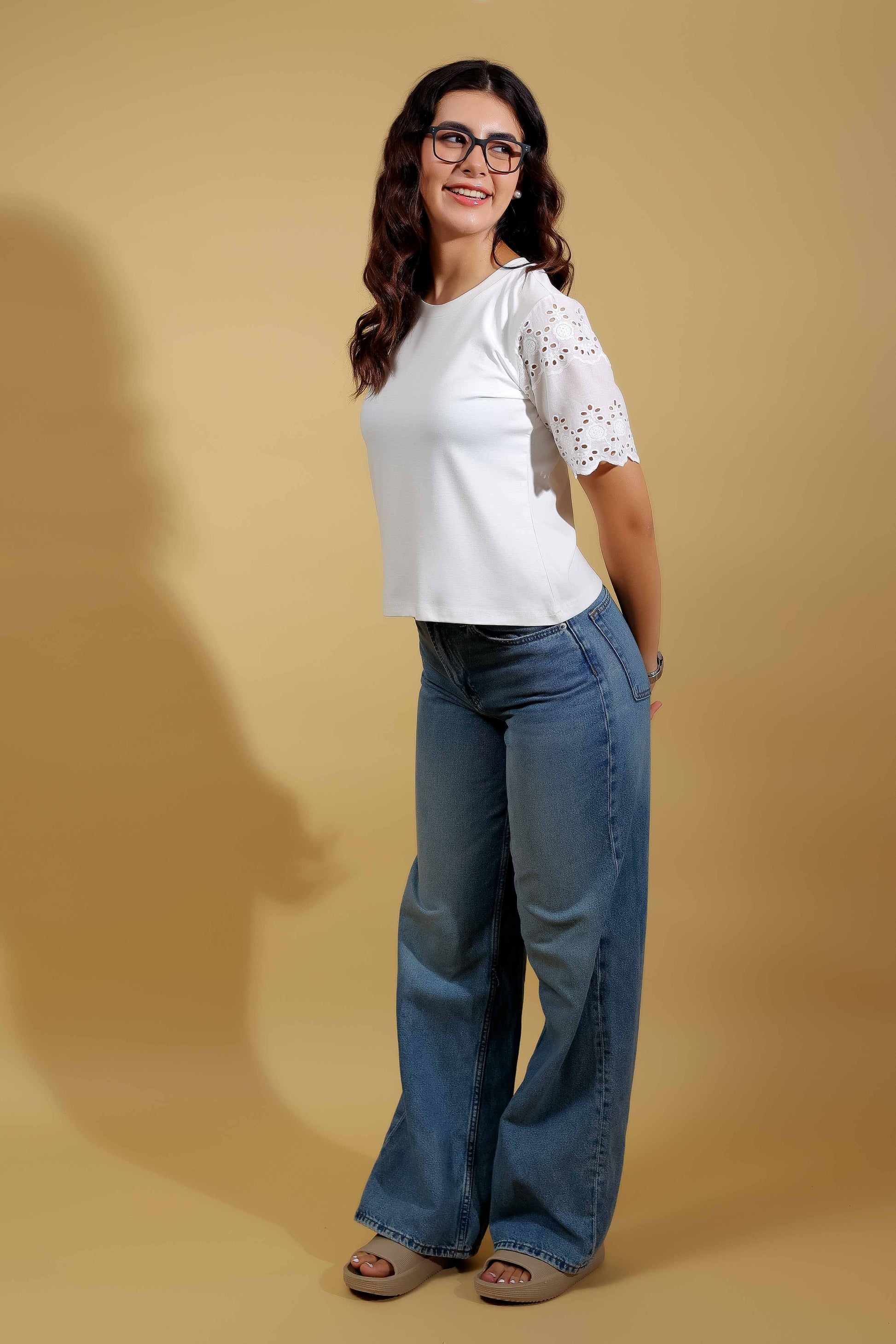 Classic White Round Neck T-Shirt With Statement Sleeves