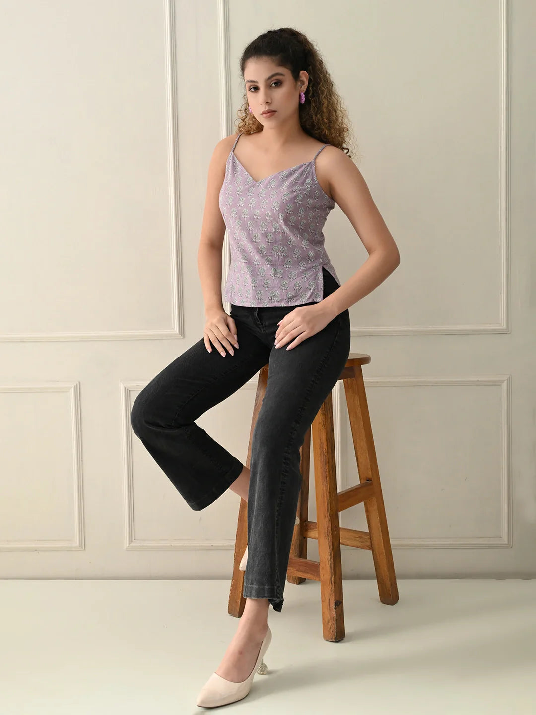 Lavender spaghetti V-neck top crafted from pure cotton, adorned with intricate handblock printed designs. Lightweight and breezy, this piece exudes effortless charm, perfect for casual days or layered boho-inspired looks.