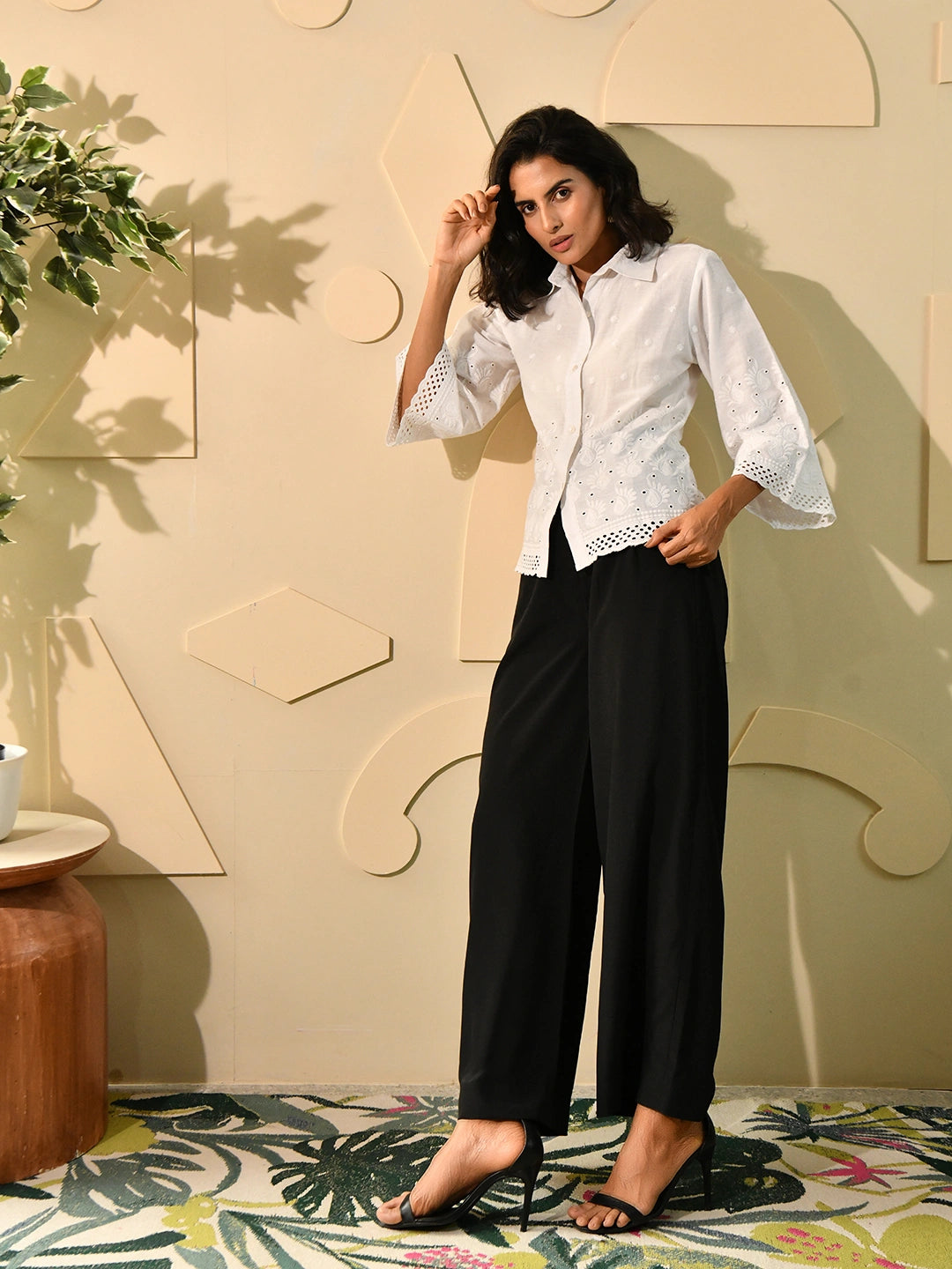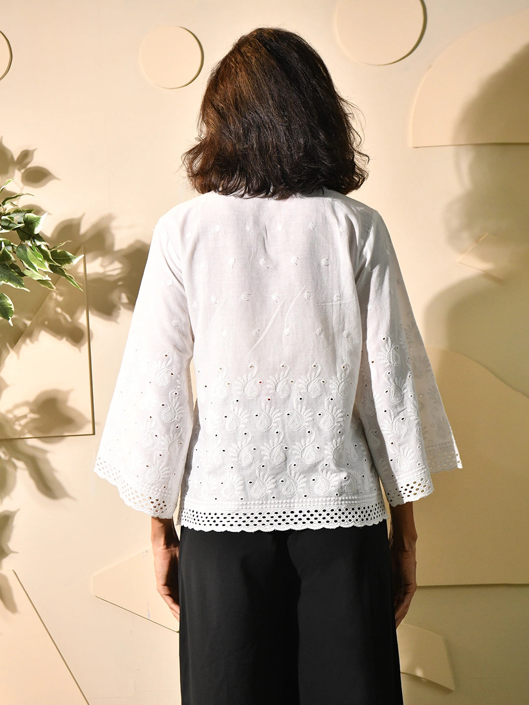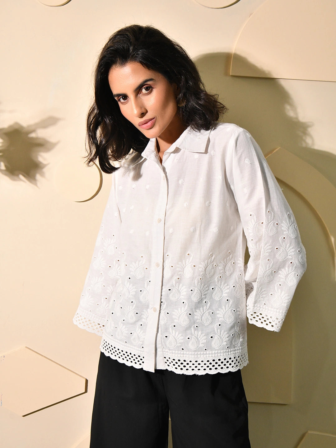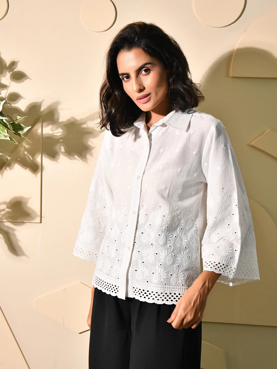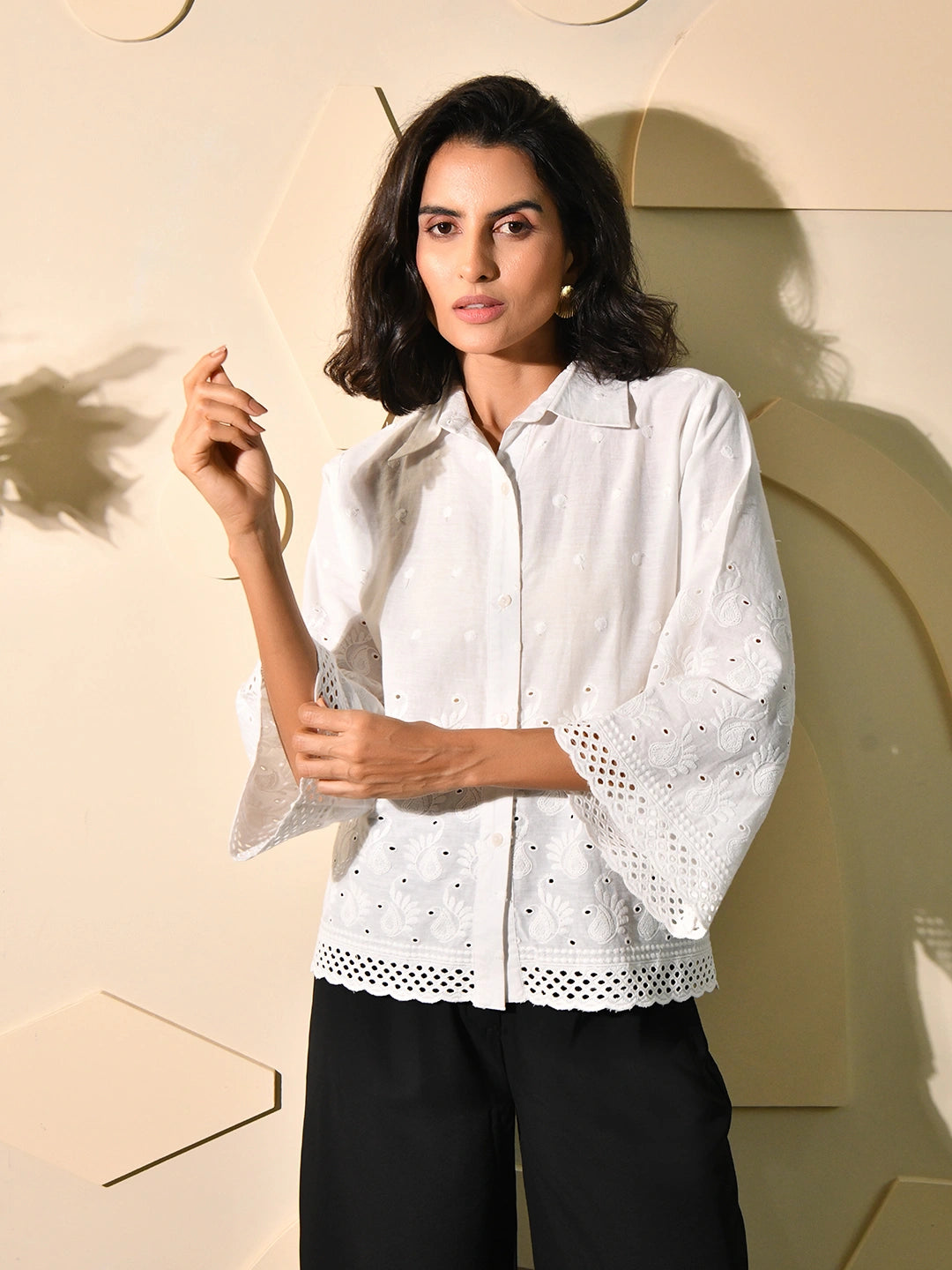Our white schiffli shirt was born for beach days and golden hour strolls. With all over motif details, an airy feel, and a loose, laid-back bell sleeve fit, it’s the kind of piece you’ll reach for all season long. Pair it with a floaty skirt, denim and add glossy lips and sunnies for the full vibe.