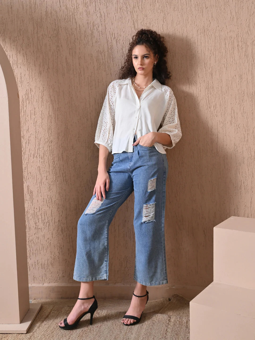Soft elegance meets subtle texture in this cream-toned raglan shirt. Crafted in breathable viscose slub, the body offers a fluid drape with a natural sheen, while the raglan sleeves are crafted from intricately detailed Schiffli, dyed to perfectly match the base. The contrast in texture adds quiet sophistication, making this piece ideal for both everyday wear and elevated styling. Pair it with tailored pants or flowy skirts for a look that’s both graceful and grounded.