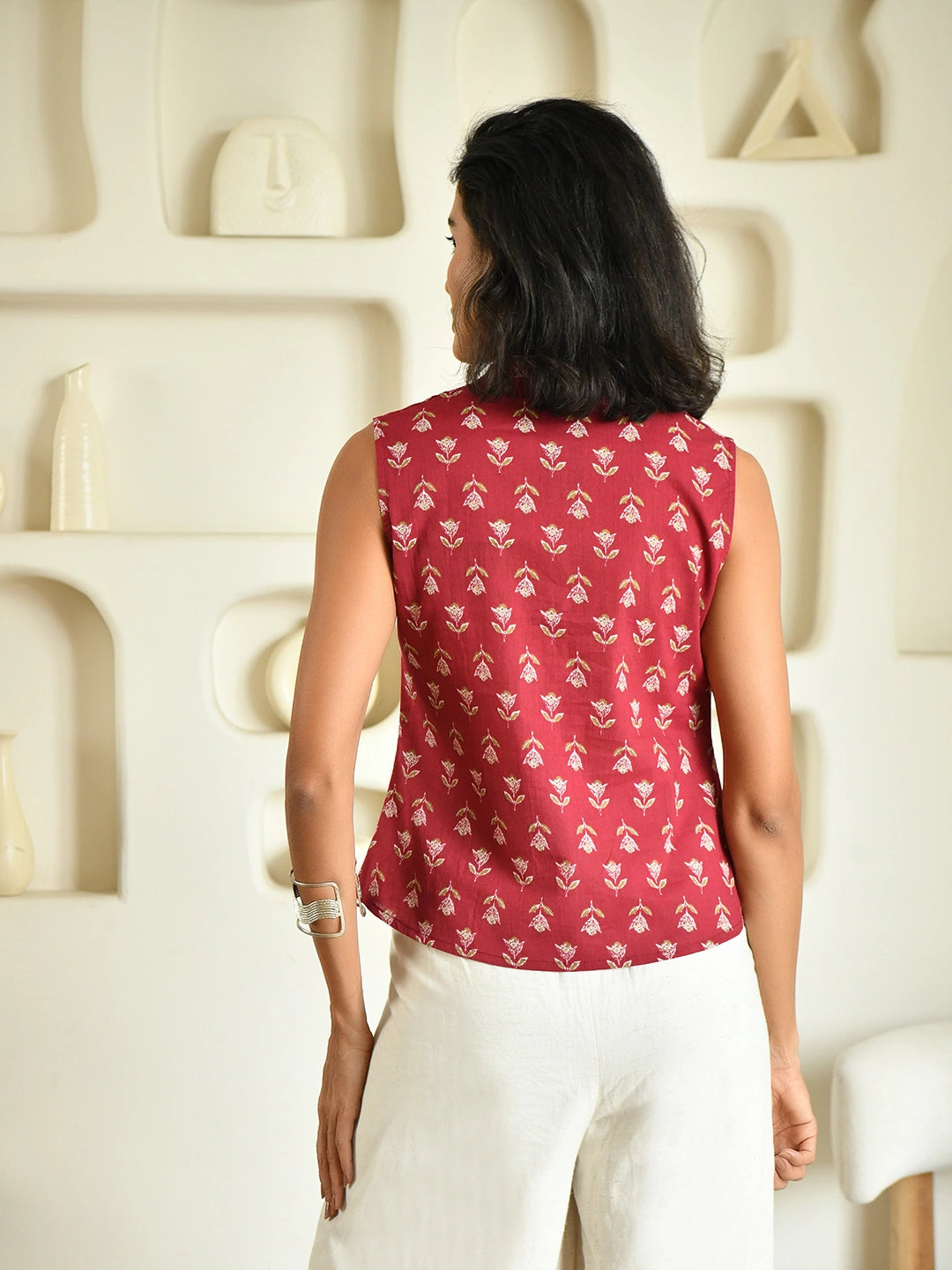 This sleeveless vest is crafted from 100% breathable cotton and features elegant floral handblock prints that lend it a timeless, artisanal charm. Designed with a flattering tailored fit and a clean V-neckline, it is finished with traditional loophole button closures that add a touch of vintage-inspired detail. Perfect for both casual and semi-formal occasions, this versatile piece pairs beautifully with skirts, trousers, or palazzos. Comfortable and chic, it's an effortless addition to your everyday wardrobe.