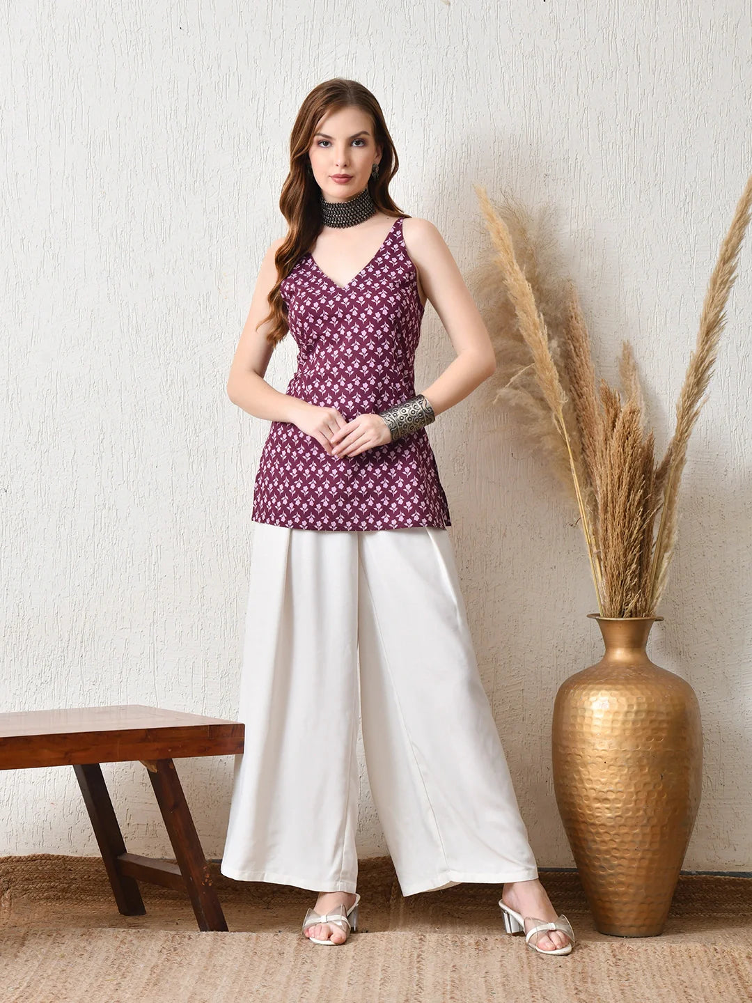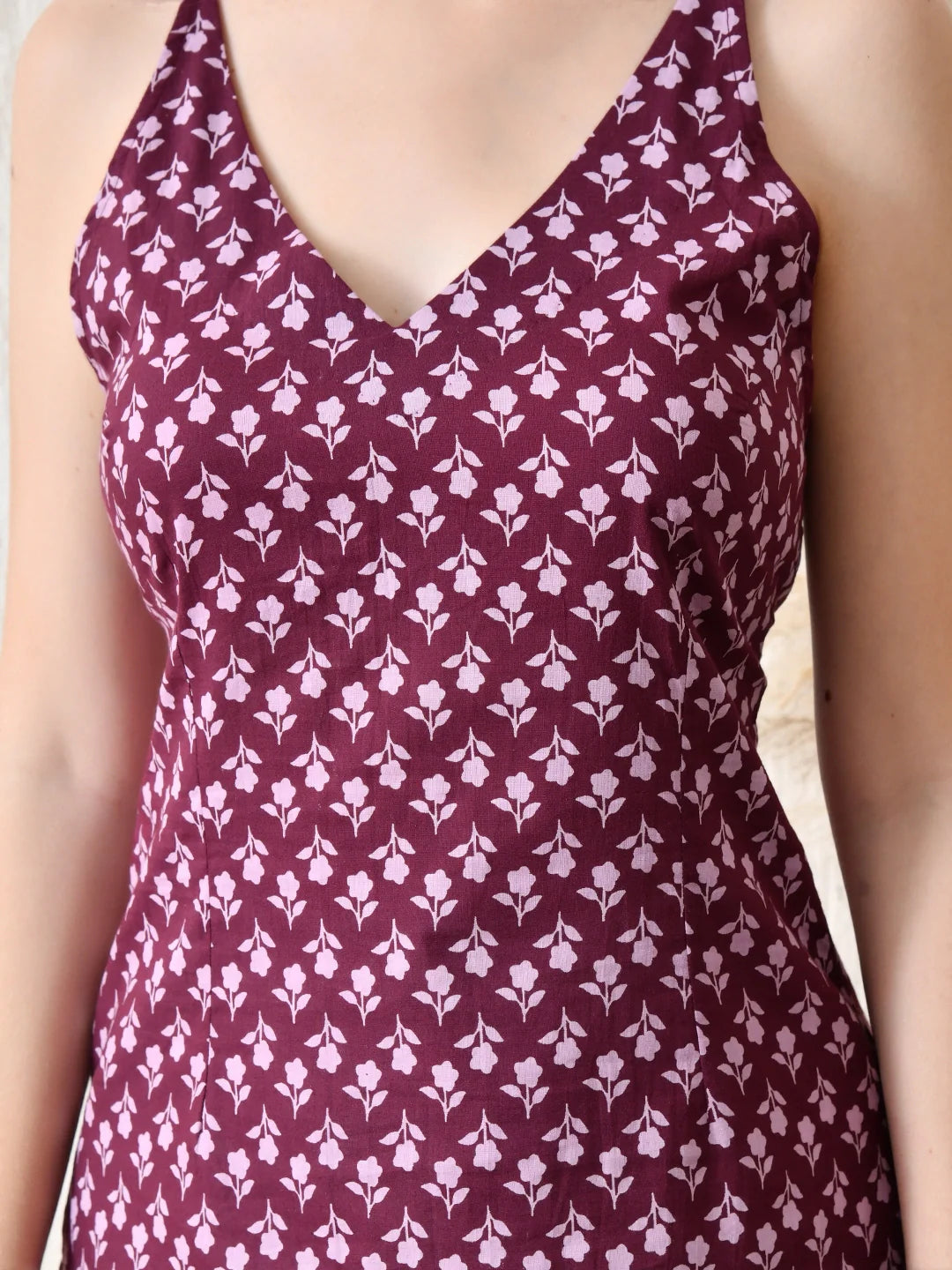 A chic V-neck top crafted in soft floral hand block printed cotton, blending traditional artistry with contemporary design. The back is styled with a corset-inspired lace-up fastener, allowing for adjustable fit and a flattering silhouette. Feminine and versatile, this piece pairs beautifully with skirts, denims, or layered bottoms — making it a perfect choice for both casual outings and festive occasions.