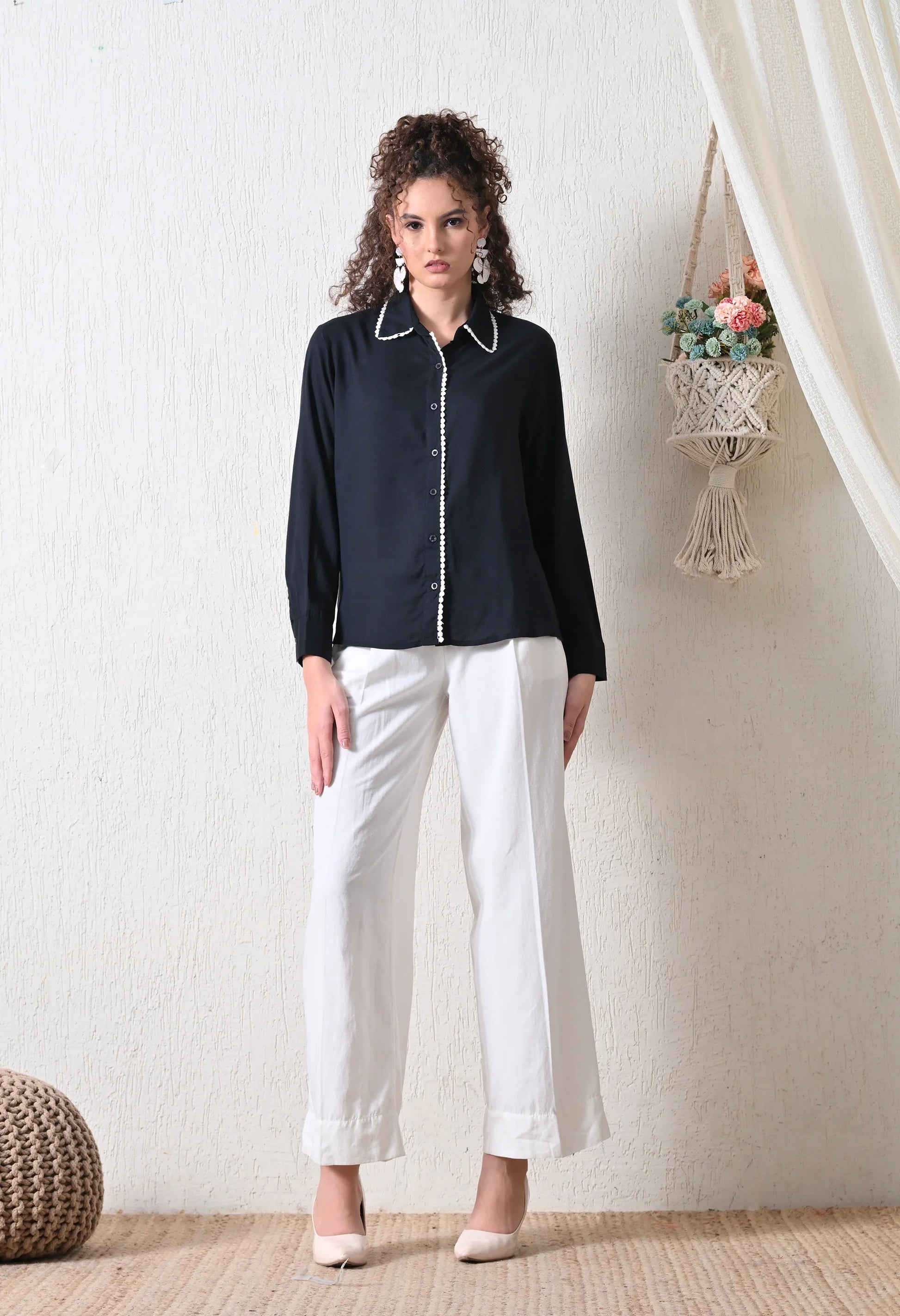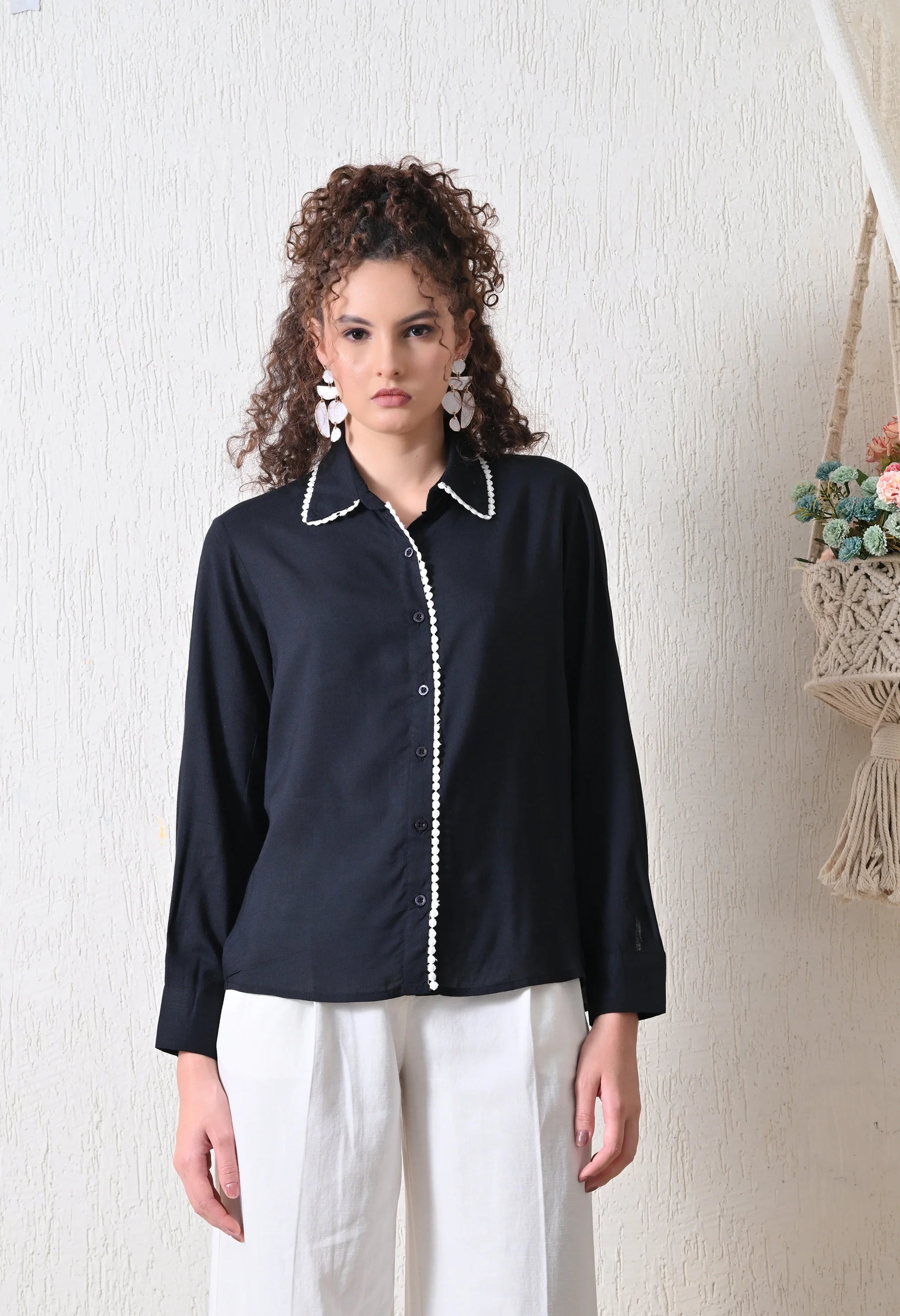 Breezy and beautiful, this elegant black shirt is your go-to for effortless summer style. Crafted from lightweight, breathable viscose, it features delicate white lace detailing that adds a soft pop of color and feminine charm. The relaxed silhouette ensures all-day comfort, while the intricate lace along the placket and collar lends an artisanal touch. Pair it with linen trousers or denim for a fresh, nature-inspired look.