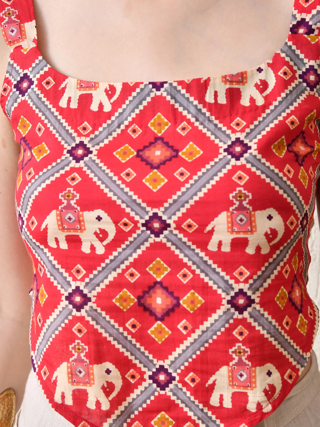 Turn heads this season with our ethnic print corset top, crafted in a chic crop length and finished with an elasticated back for a comfortable fit. The structured corset silhouette brings a touch of festive glamour, while the vibrant ethnic motifs add a playful boho spirit. Perfectly versatile, this top pairs effortlessly with skirts, shararas, or high-waist trousers making it your go-to piece for both festive celebrations and laid-back bohemian styling.