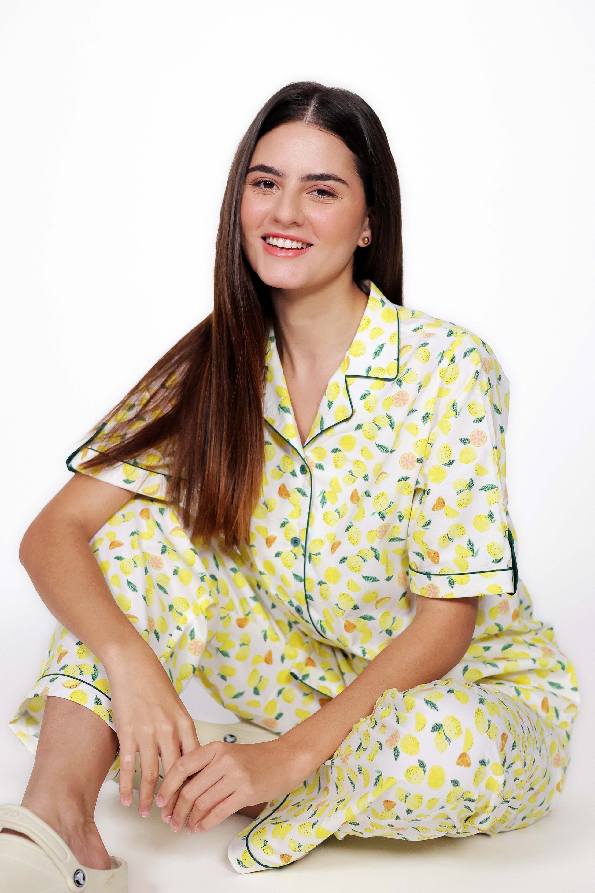 This stylish set is crafted from a soft Cotton Viscose blend, offering both comfort and breathability. The top features a button-down design with a notched collar and contrasting edge piping, adding a sophisticated touch to the overall look. The half sleeves can be rolled up for a more relaxed vibe, complete with contrast piping and button loop details for a polished finish. The matching straight-leg pants offer a loose, relaxed fit for ultimate comfort, and the half-elasticated waistband ensures an easy pull-on style. The combination of white and yellow hues makes this set a perfect choice for a chic and casual look.