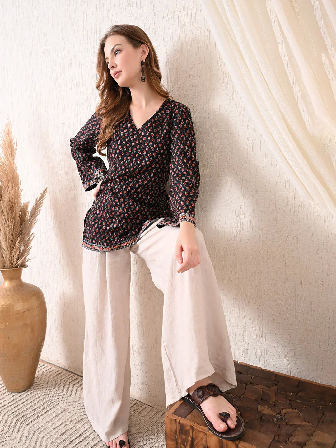 A versatile V-neck top crafted in beautifully hand block printed cotton, designed in an elegant shade of black. Featuring wide 3/4th sleeves for a relaxed yet structured silhouette, this piece effortlessly blends festive charm with contemporary ease. Lightweight, breathable, and strikingly detailed, it's perfect for both special occasions and everyday elevated dressing.