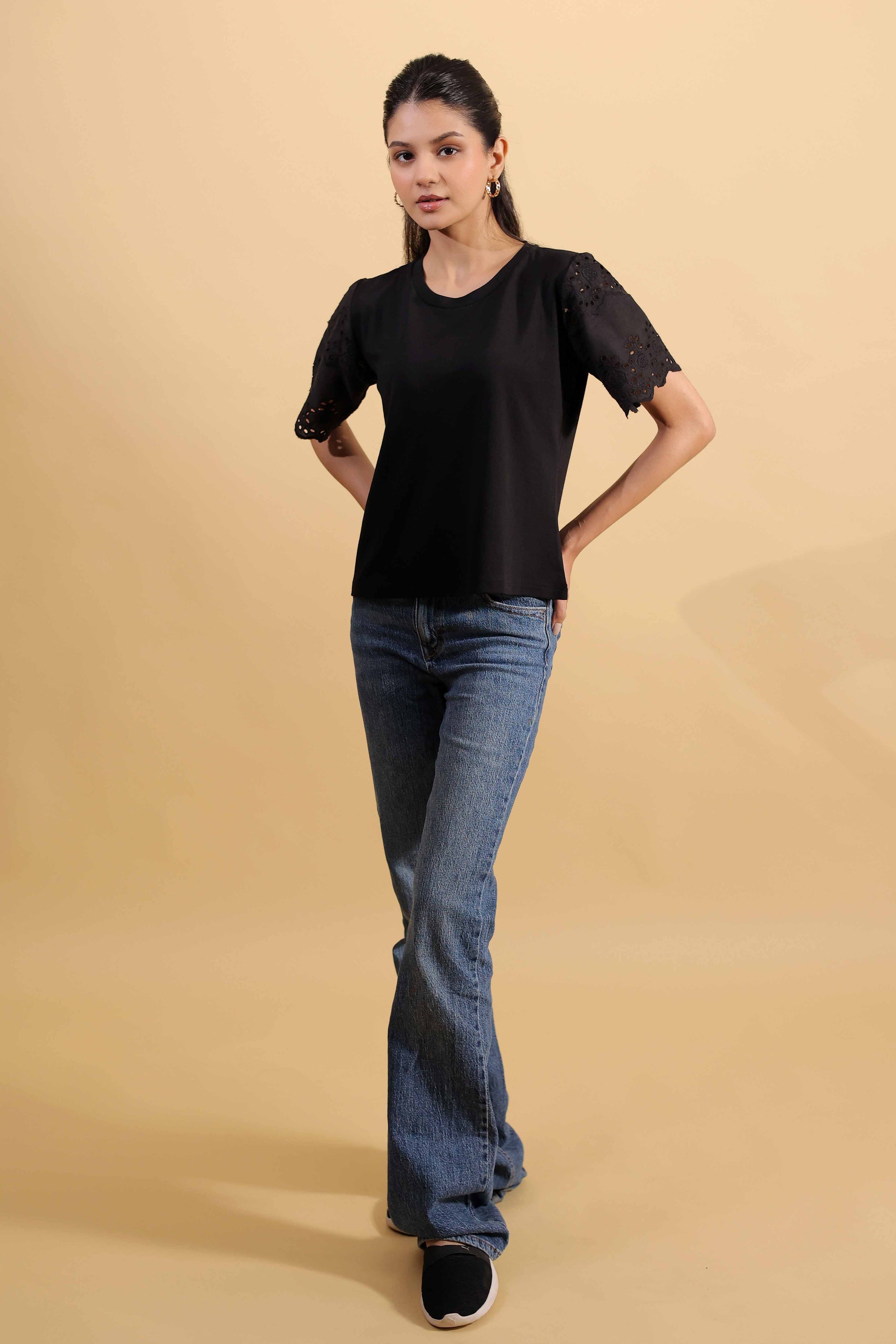 Midnight Black Round Neck T-Shirt With Statement Sleeves