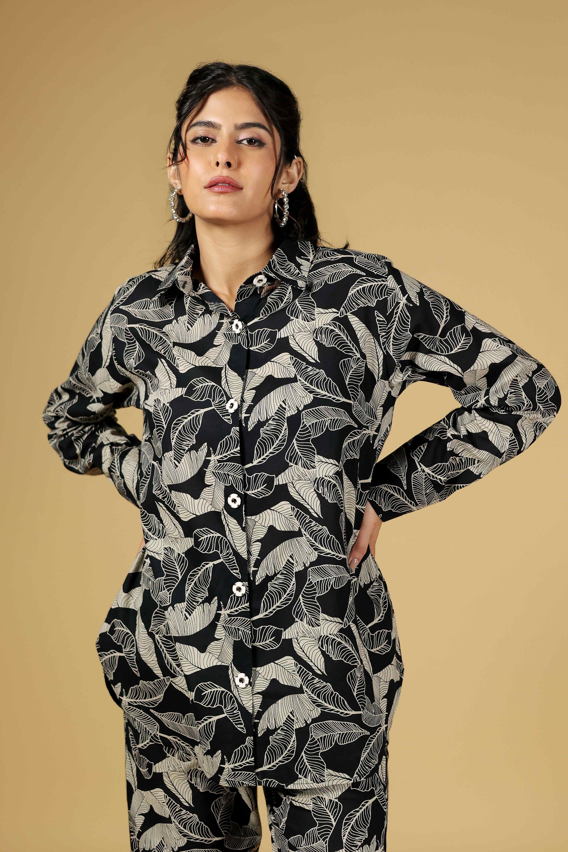 Unleash effortless sophistication with the Midnight Leaf Co-Ord Set. This ensemble features a collared button-down top and wide-leg pants, both adorned with a striking monochrome botanical print.
