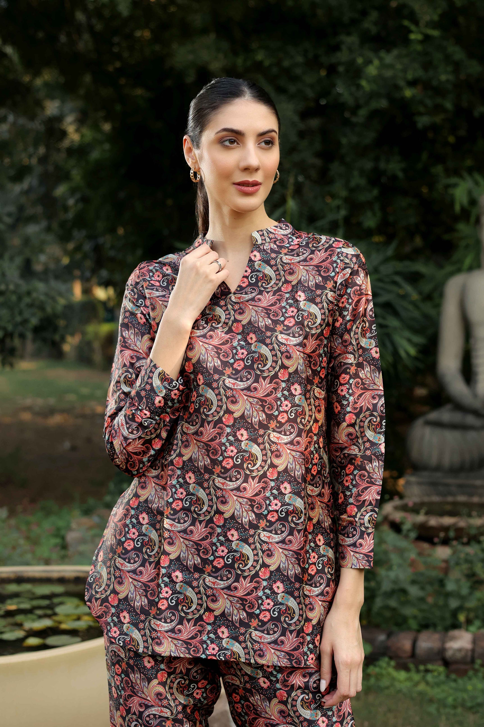 This stylish ensemble features a tunic crafted from luxurious Mango Silk fabric, adorned with a classic black paisley print for a timeless, sophisticated look.