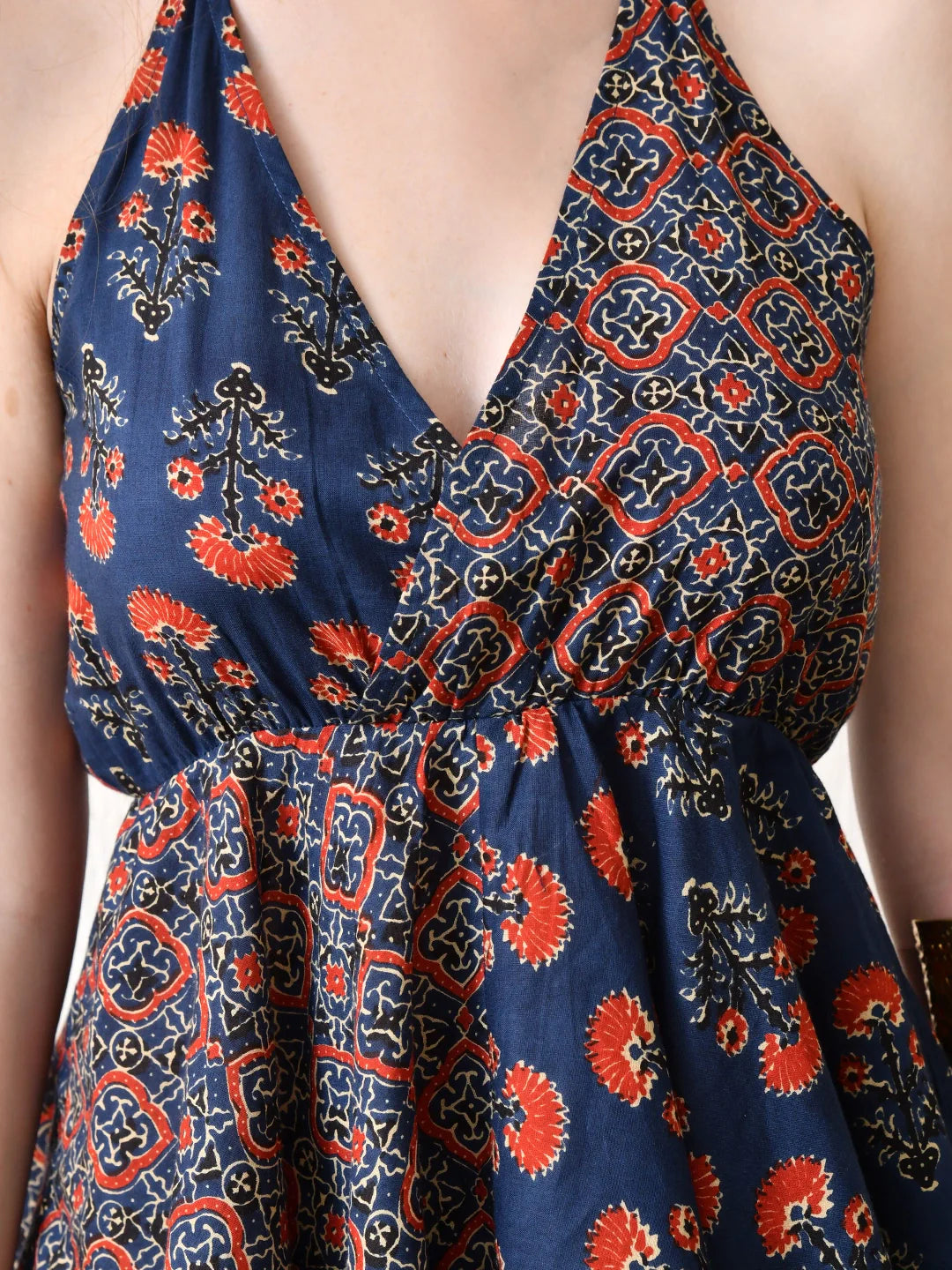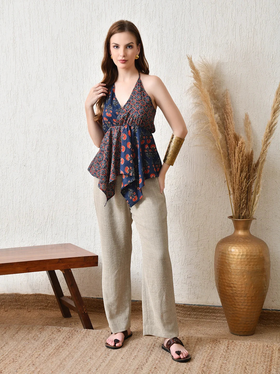 A bold blend of tradition and trend — this Neel hand block printed top features an asymmetrical handkerchief hem, delicate neck tie-up, and an elasticated back for a flattering, flexible fit. Crafted in soft cotton, it's made to move with ease and elegance.