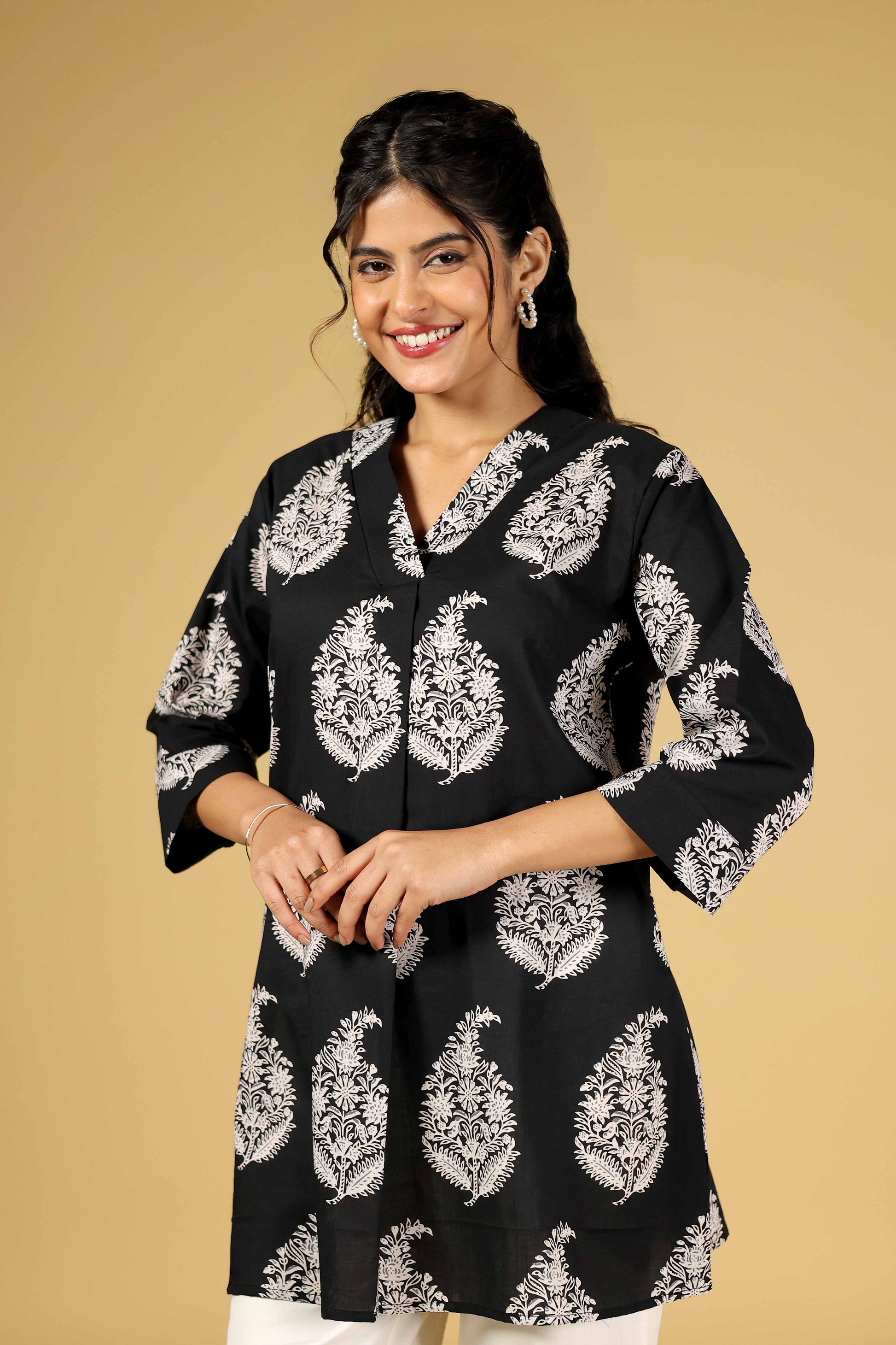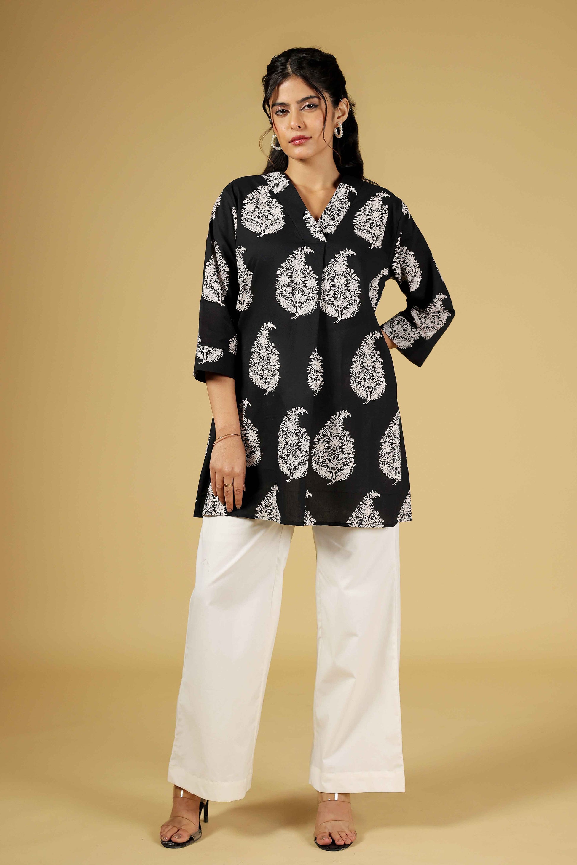 Crafted from Cotton Fabric, this black and white printed set combines style and comfort. The A-line tunic features an overlapped V-neckline and inverted box pleating, adding a flattering shape.