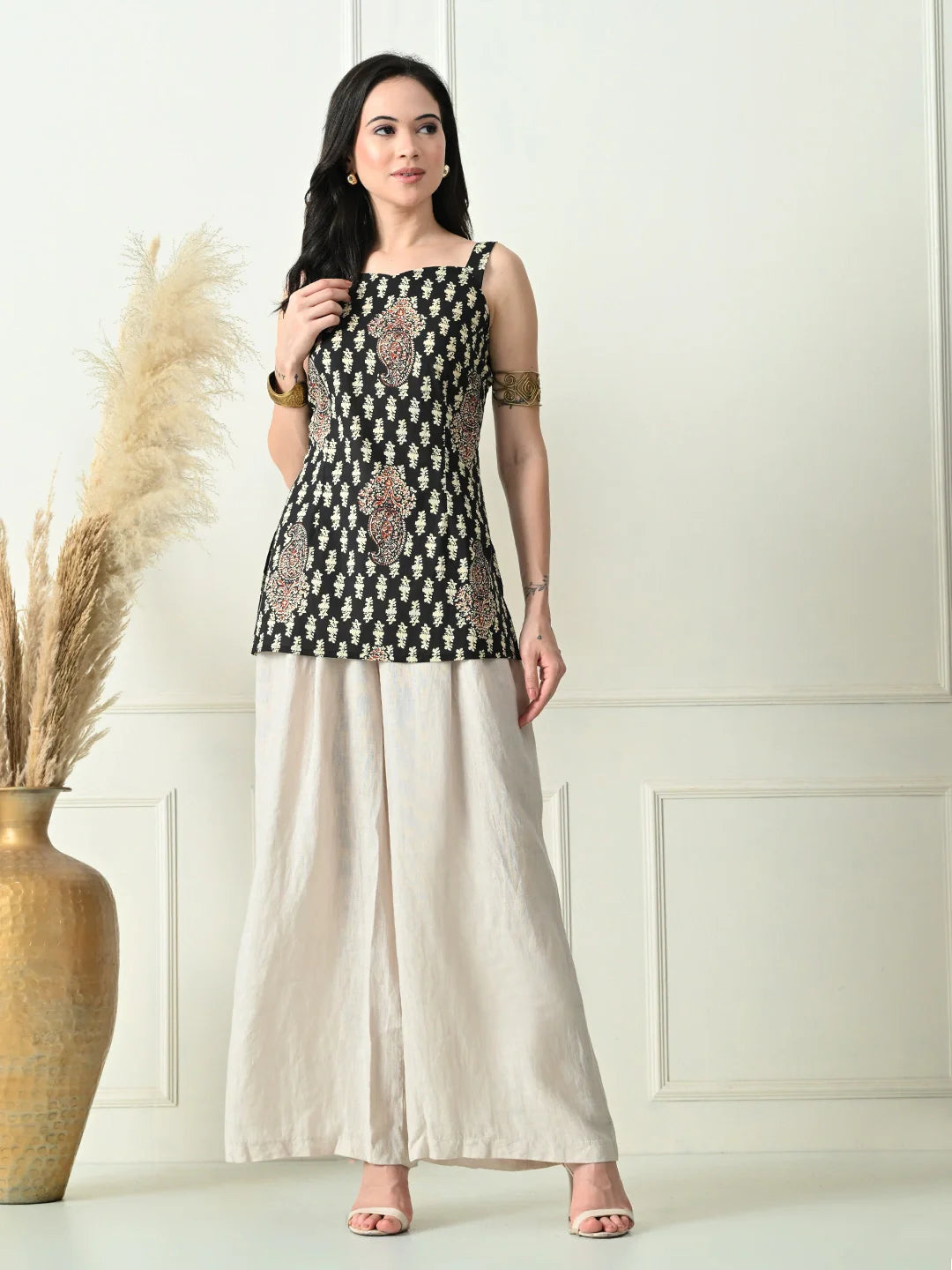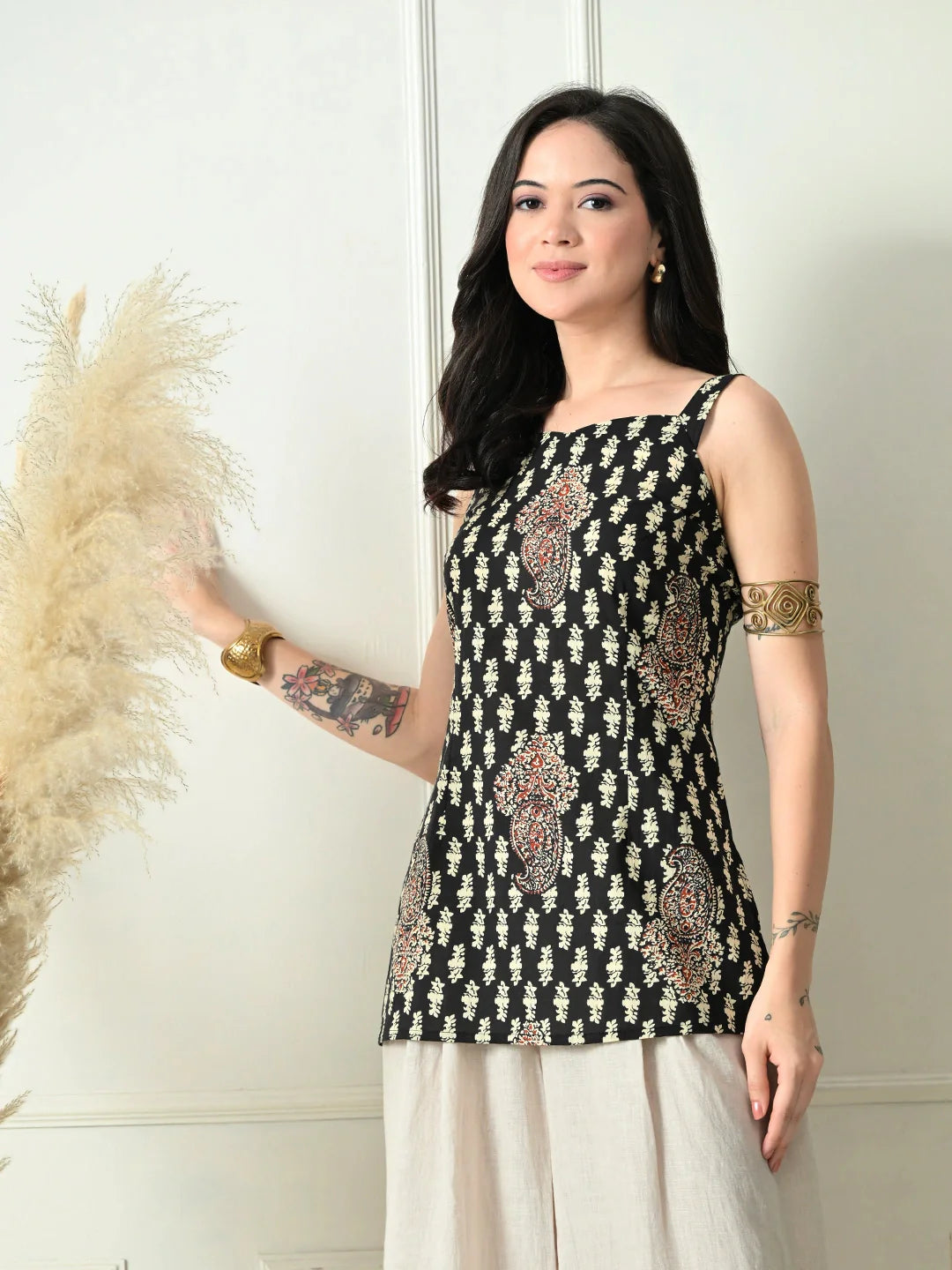 | Elevate your everyday style with this square neck top crafted from breathable paisley hand block printed cotton. The clean neckline frames the collarbone beautifully, while the back is accentuated with delicate shell lace detailing for a touch of artisanal charm. Effortlessly stylish and versatile, this piece pairs well with both casual bottoms and festive layers, making it a wardrobe essential with timeless appeal. |