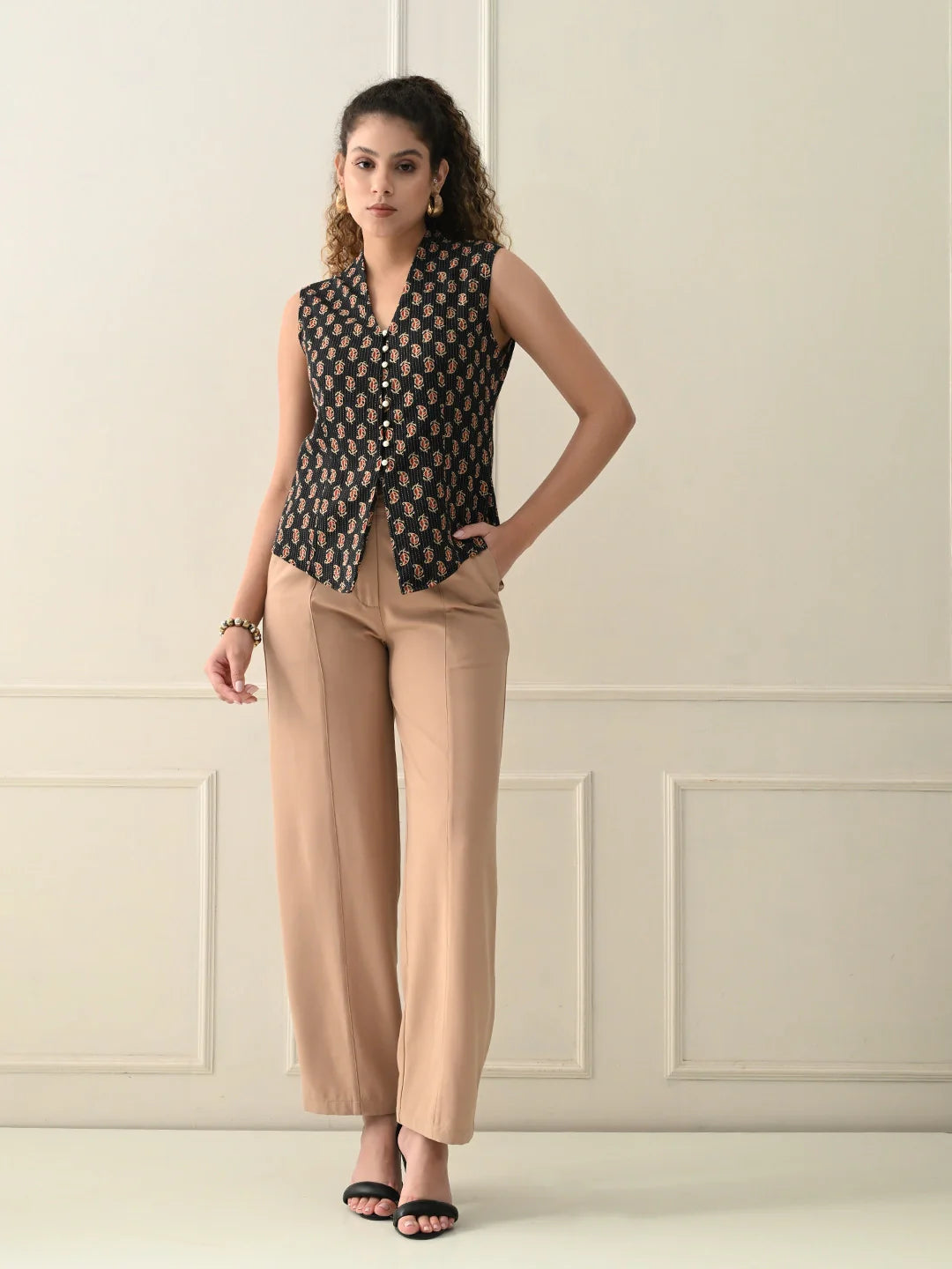 This sleeveless indigo vest is crafted from 100% breathable cotton and features elegant ivory floral hand-block prints that lend it a timeless, artisanal charm. Designed with a flattering tailored fit and a clean V-neckline, it is finished with traditional loophole button closures that add a touch of vintage-inspired detail. Perfect for summers and both casual and semi-formal occasions, this versatile piece pairs beautifully with skirts, trousers, or palazzos. Comfortable and chic, it's an effortless addition to your everyday wardrobe.