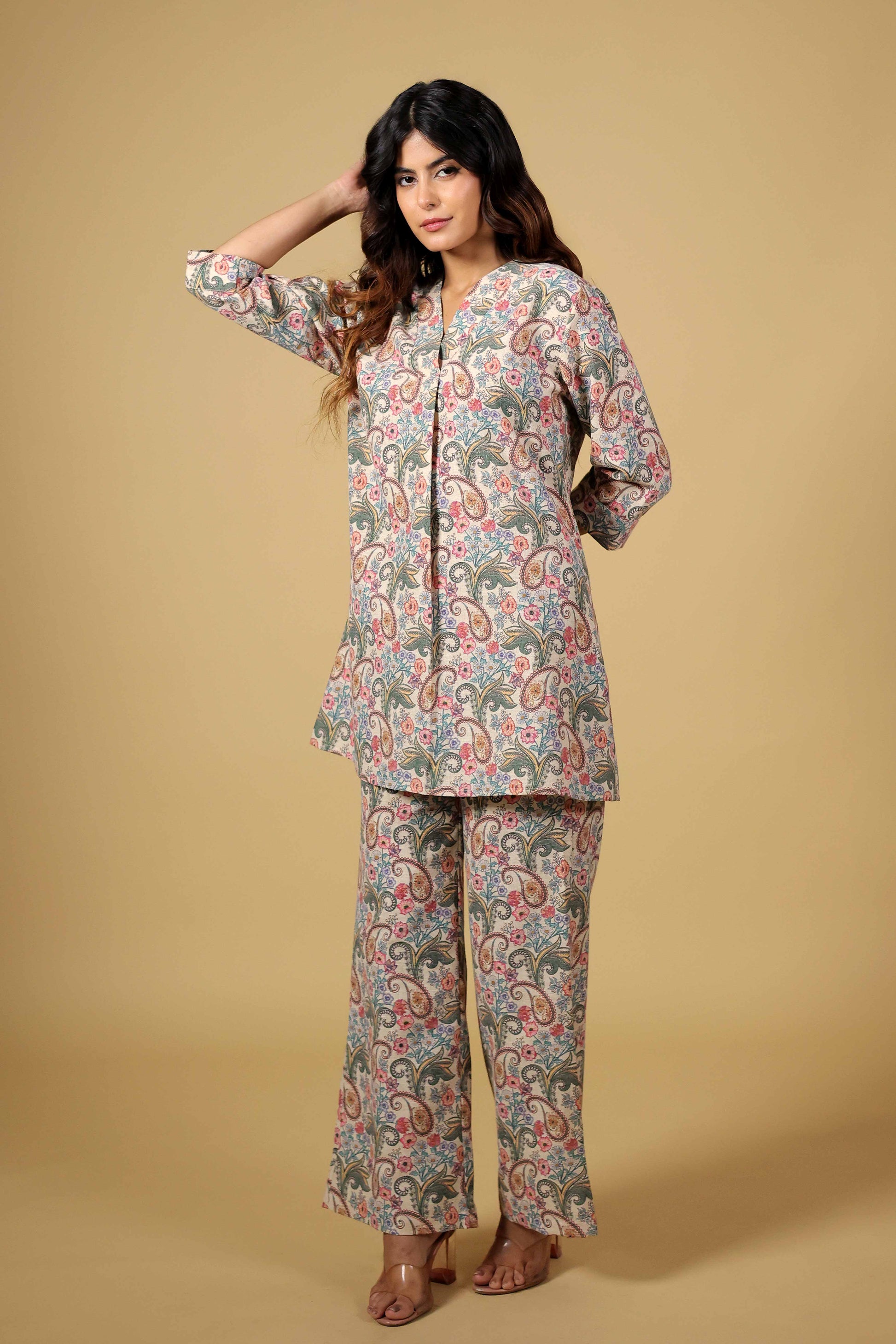Made from linen, this off-white Paisley printed set offers both comfort and style. The A-line tunic features an overlapped V-neckline with pleat creating a flattering silhouette.