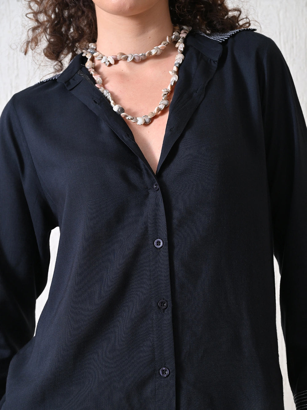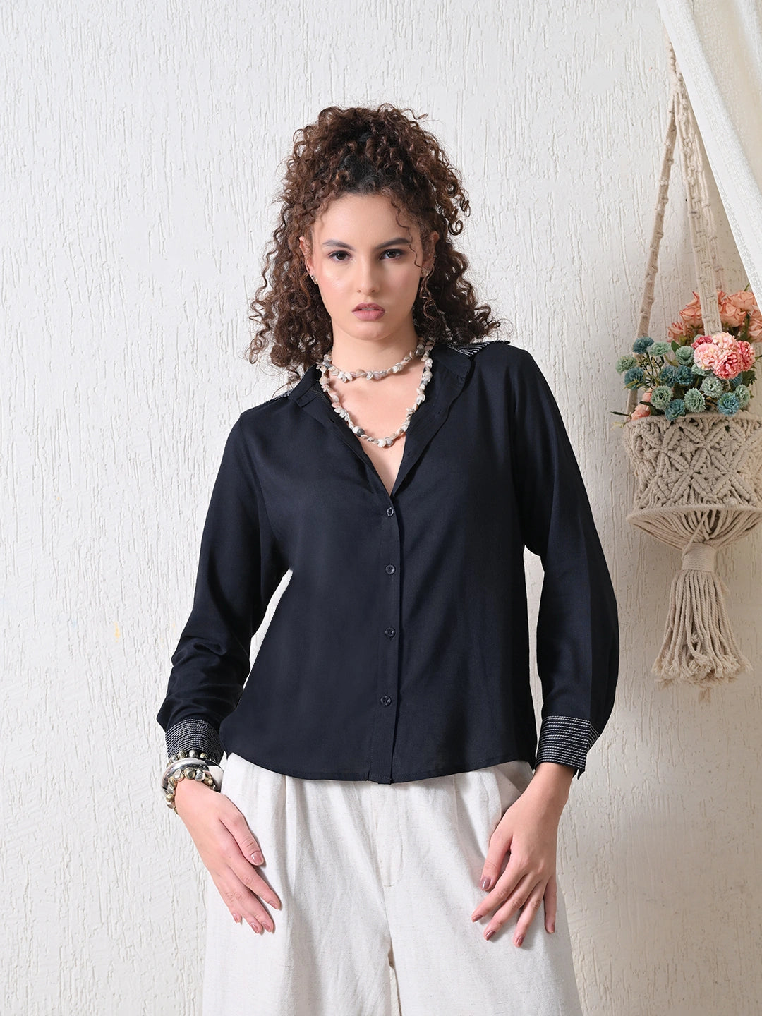 Rich in tone and detail, this black shirt is crafted from soft viscose slub fabric, offering a fluid drape and subtle texture. The handcrafted Kantha stitch lines on the collar and cuffs add a refined, artisanal touch—celebrating traditional craft with contemporary flair. Designed in relaxed silhouette and clean finish, this piece transitions effortlessly from day to evening, blending heritage with everyday elegance.
