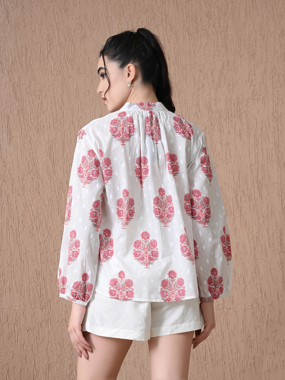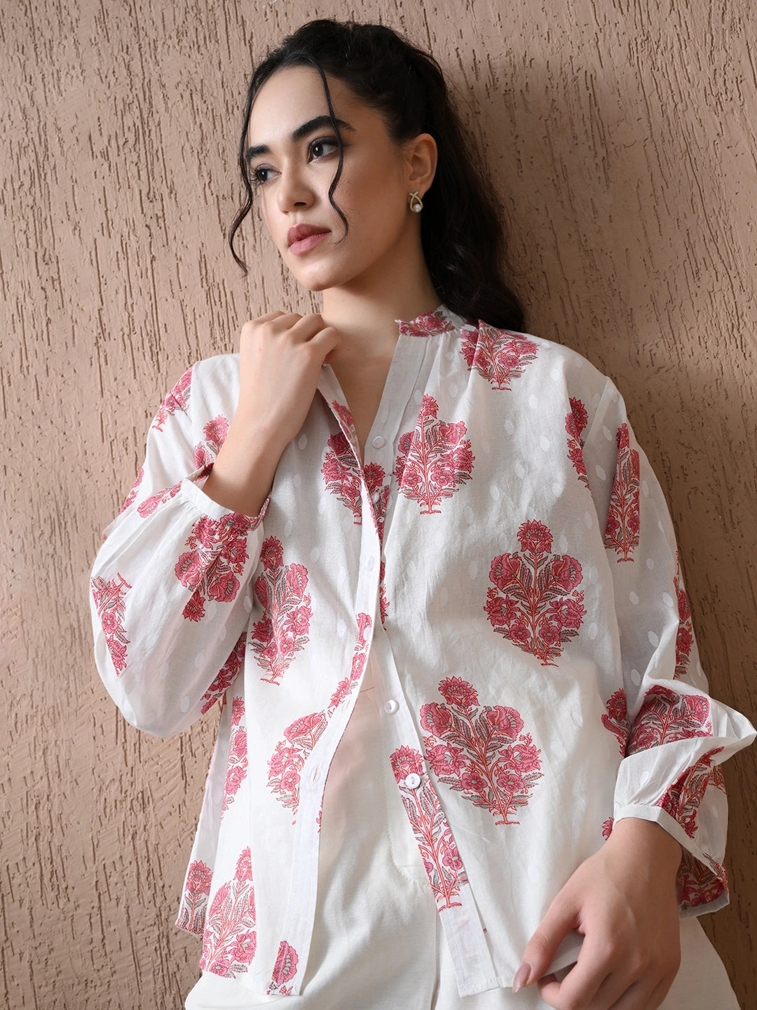 Crafted in breezy white cotton, this raglan-sleeved shirt is a summer essential reimagined with artisanal charm. The relaxed silhouette features a clean band collar and soft raglan seams for effortless ease. Handblock printed in refreshing teal motifs, each piece carries the beauty of traditional craft with a modern touch. Lightweight and breathable, it’s perfect for warm days—pair it with denims or earthy-toned trousers for a casual yet cultured look.