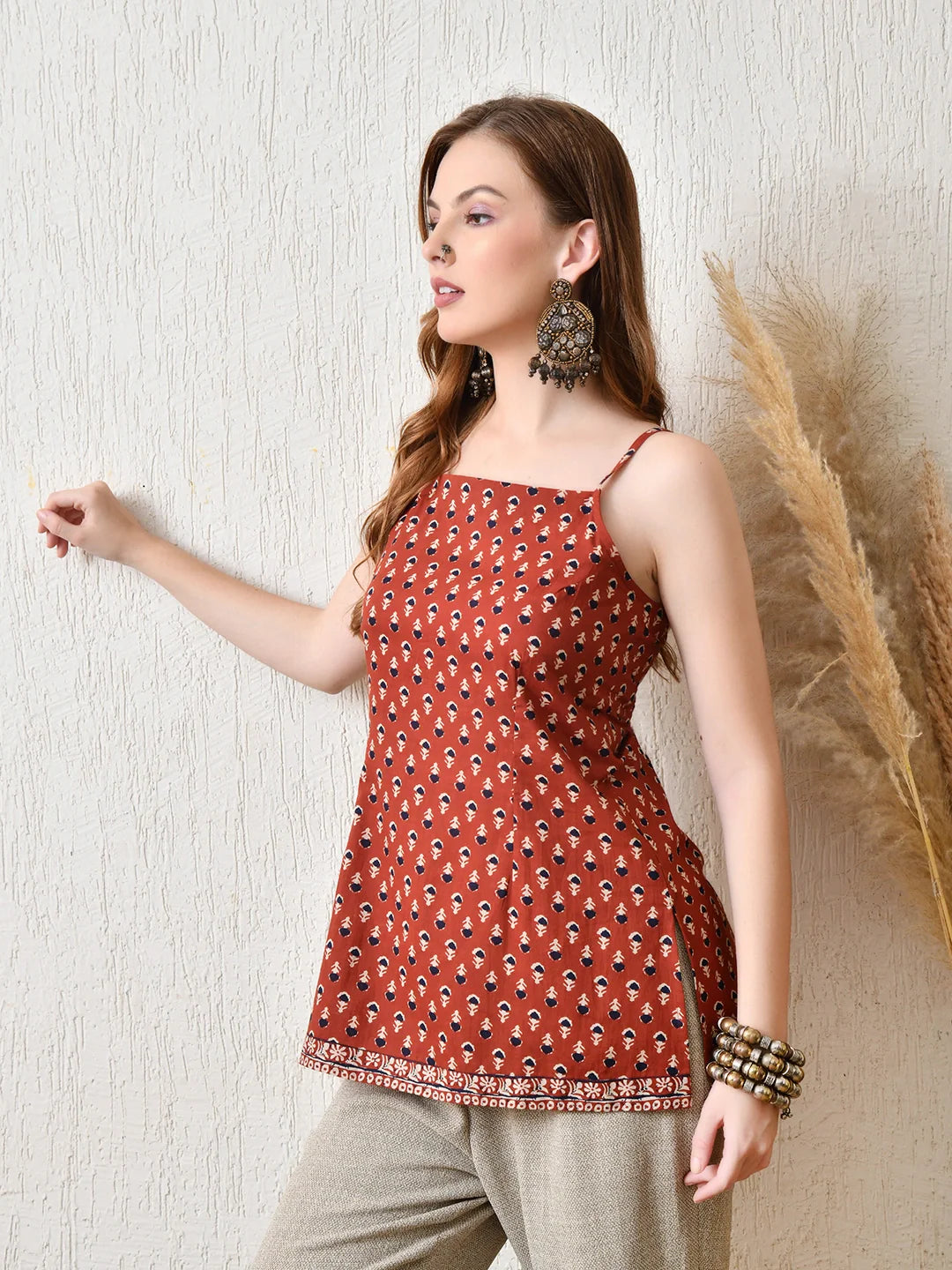 Stay effortlessly stylish in this long top crafted from red handblock printed cotton. Featuring adjustable straps for a perfect fit and side slits for ease of movement, this versatile piece blends comfort with artisanal charm. Perfect to wear as a standalone top or layered over pants and skirts for a chic, festive-boho look.