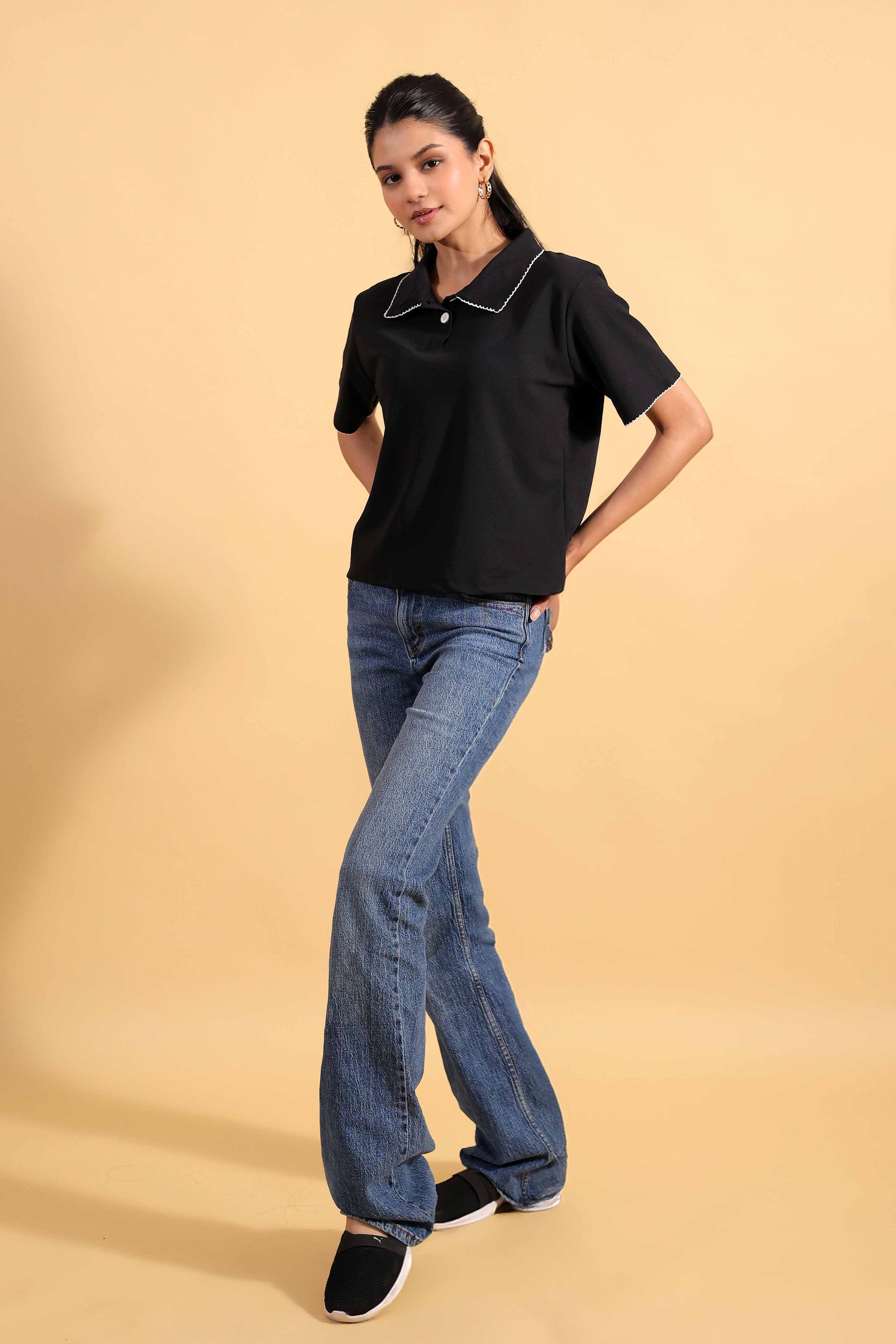Introducing our sophisticated black collar t-shirt, designed for both comfort and versatility. Featuring a sleek white stitched collar, this t-shirt adds a touch of elegance to your casual wardrobe. Crafted from premium fabric, it offers a soft feel against the skin while ensuring durability that stands the test of time.