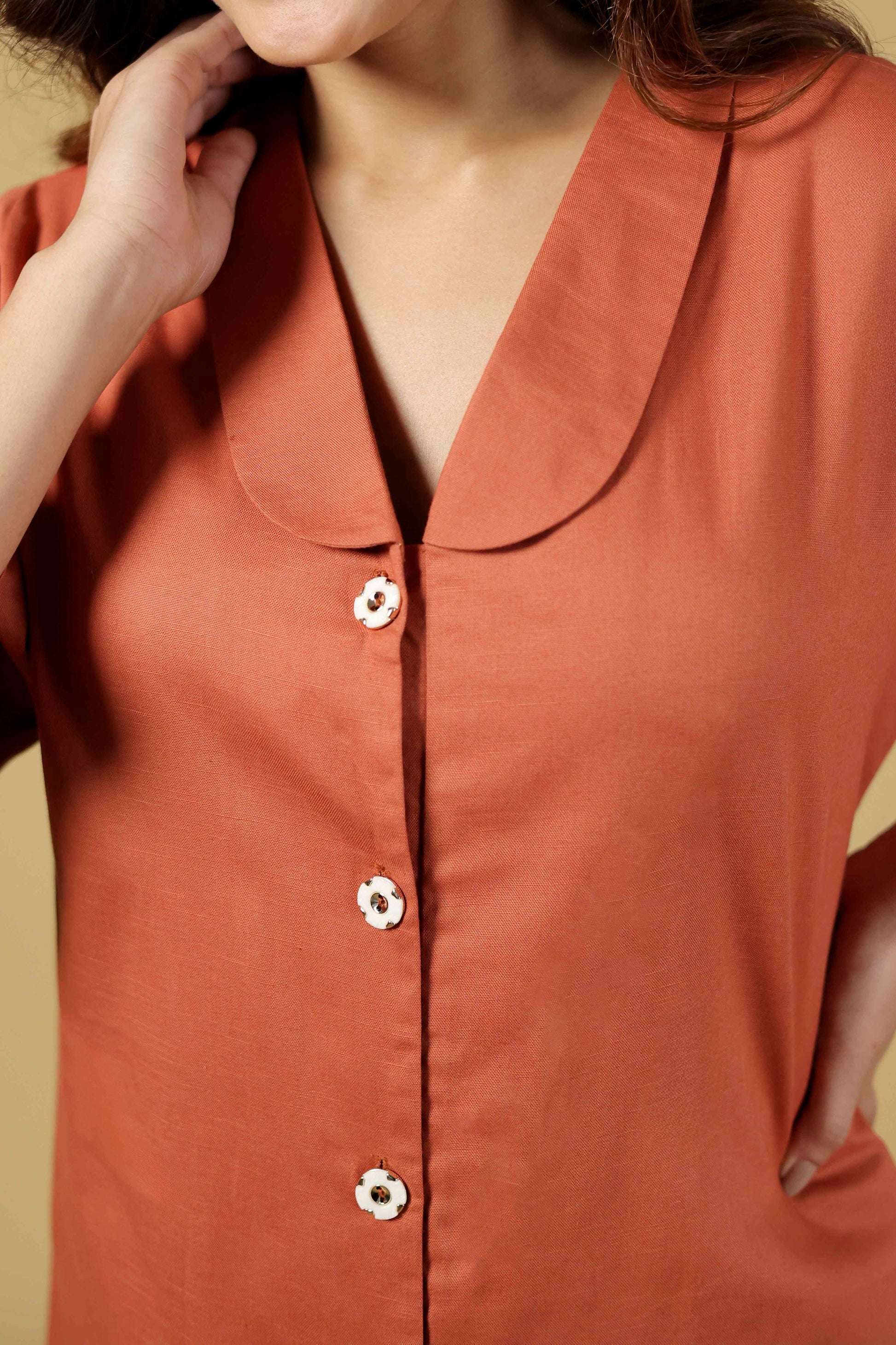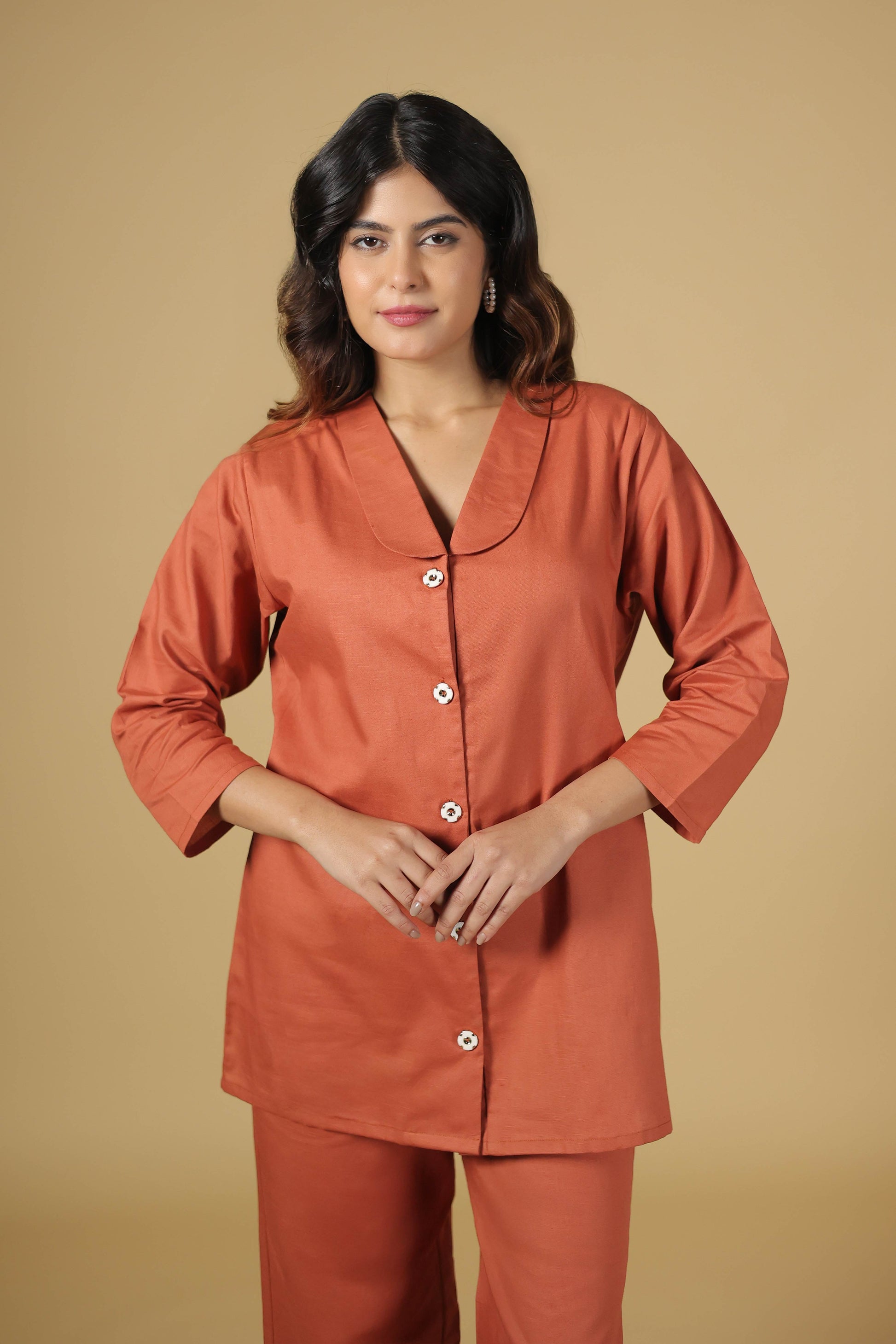 Embrace effortless elegance with this beautifully tailored linen co-ord set in a warm rust hue. Designed for both style and comfort, this set features a longline button-down shirt with a subtle V-neck peter pan collar and relaxed full-length sleeves, making it perfect for casual outings or semi-formal occasions.