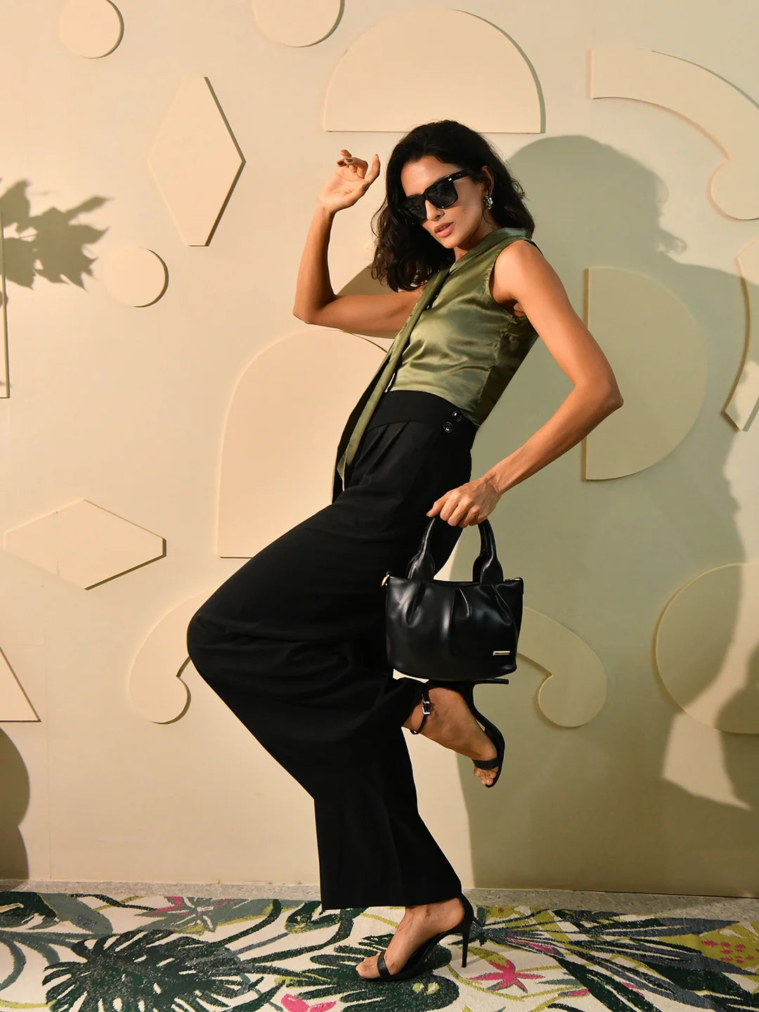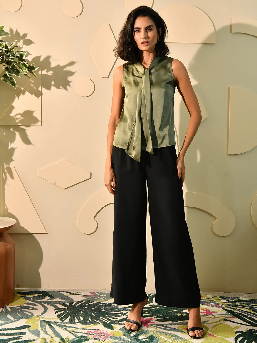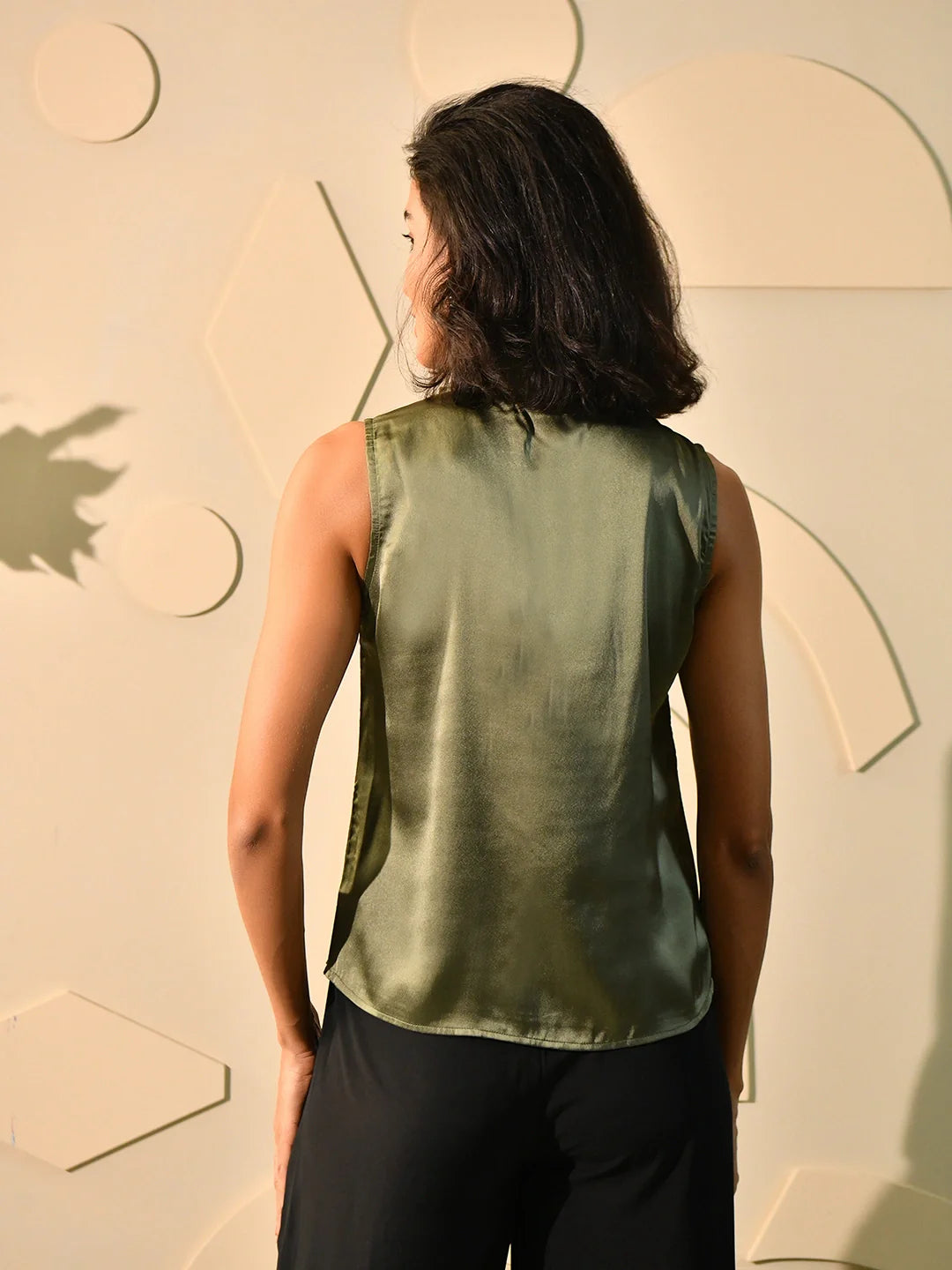 Lustrous and refined, this moss green tie-up top is crafted from smooth satin for an elevated, occasion-ready feel. The subtle sheen of the fabric catches the light beautifully, while the relaxed fit is cinched at the neckline with a graceful front tie, creating a flattering silhouette. With its clean V-neckline and fluid drape, this piece pairs effortlessly with tailored trousers or a sleek skirt—perfect for work events, evening dinners, or anytime you want to exude understated glamour.